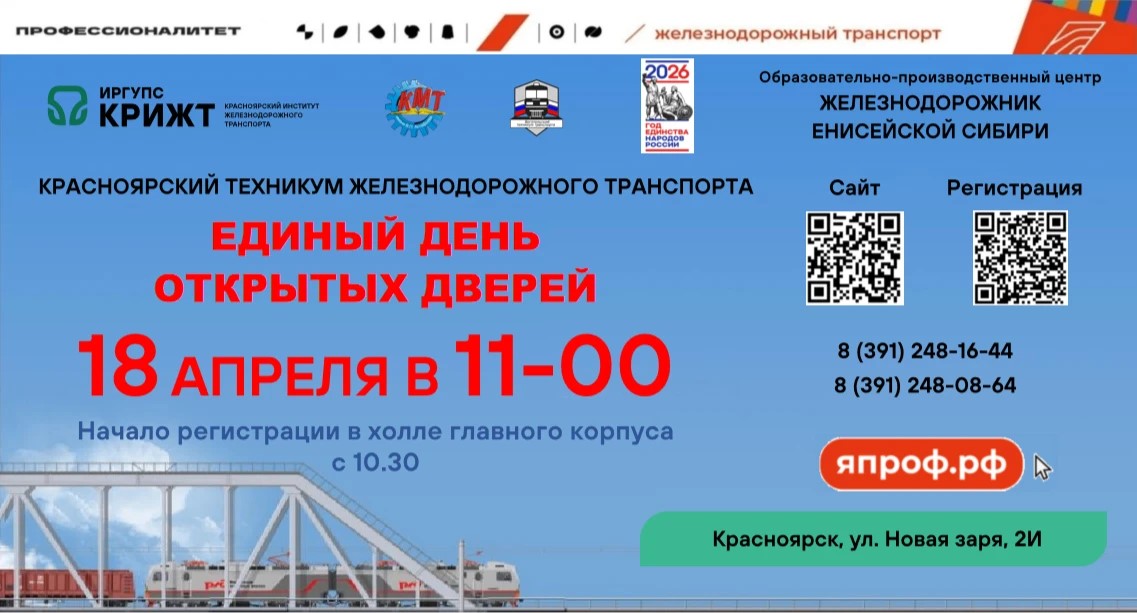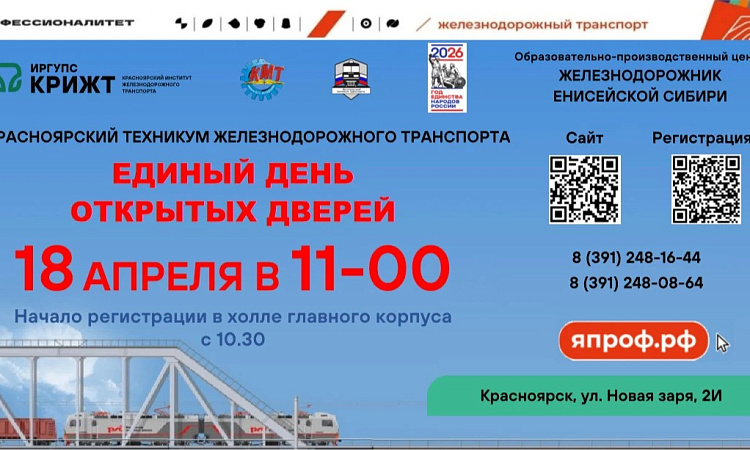 Красноярский железнодорожный техникум приглашает вас на День открытых дверей, который состоится 18 апреля 2026 года в 11:00.