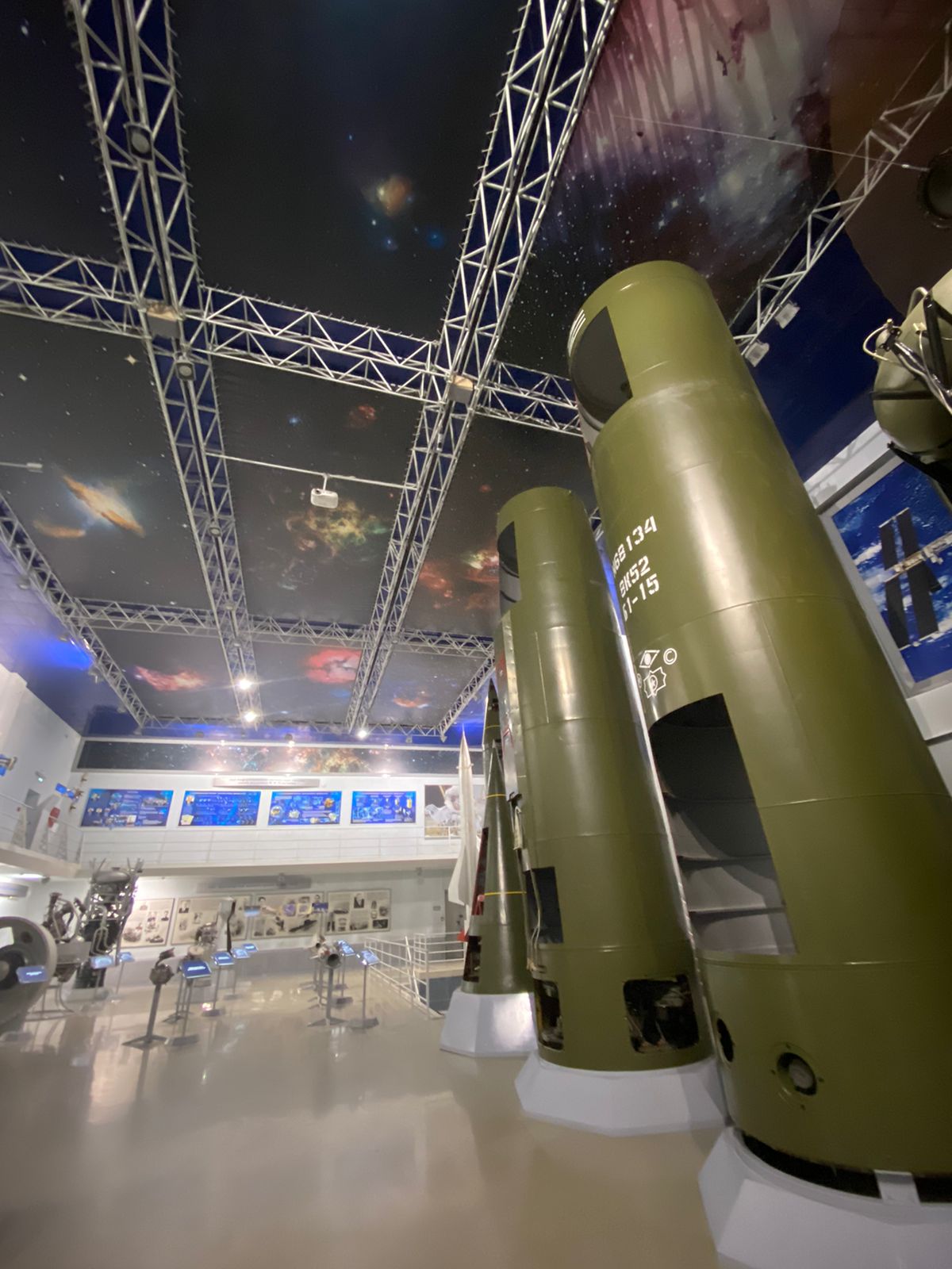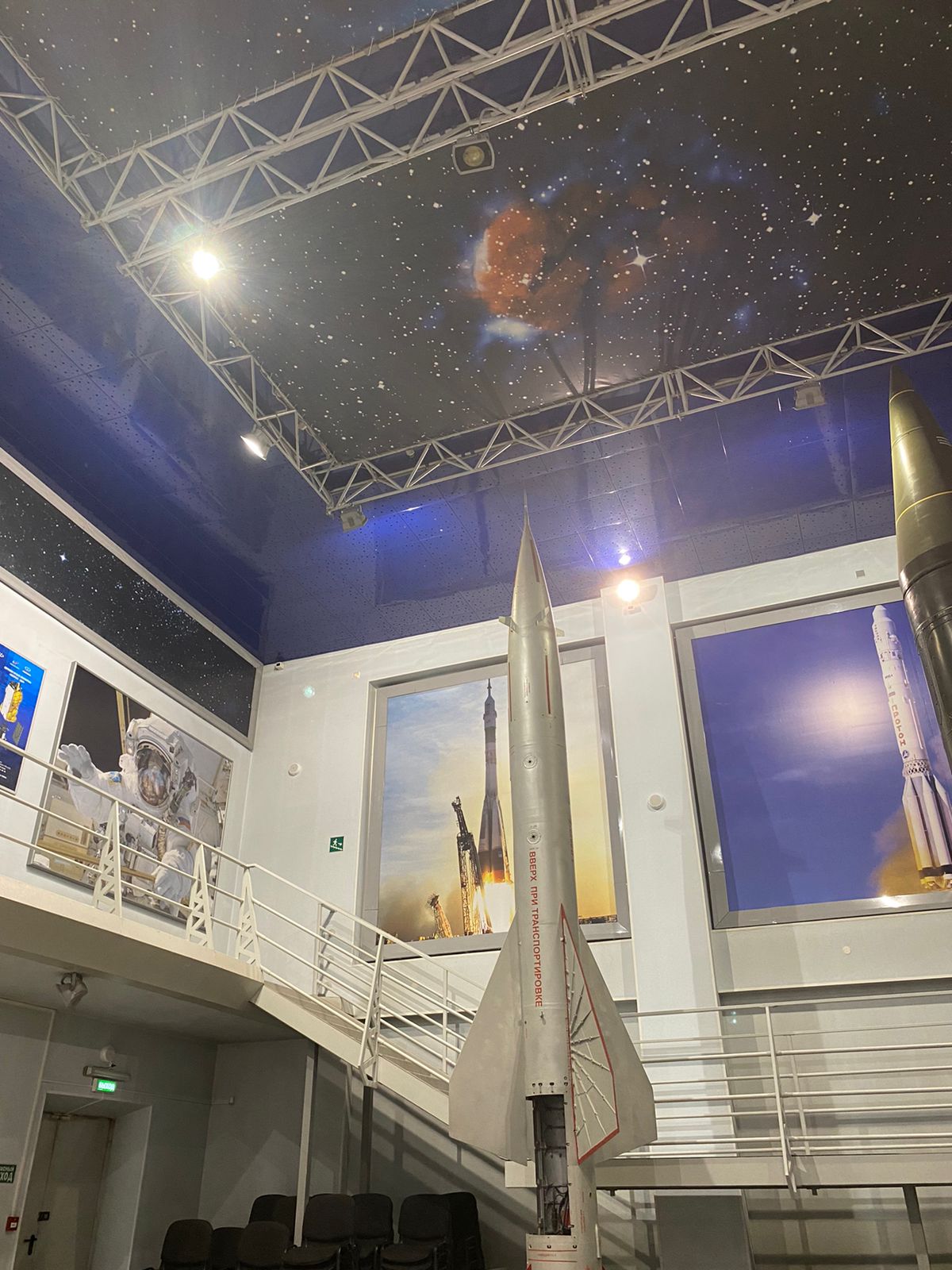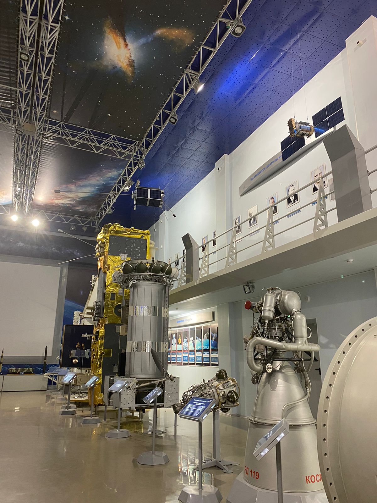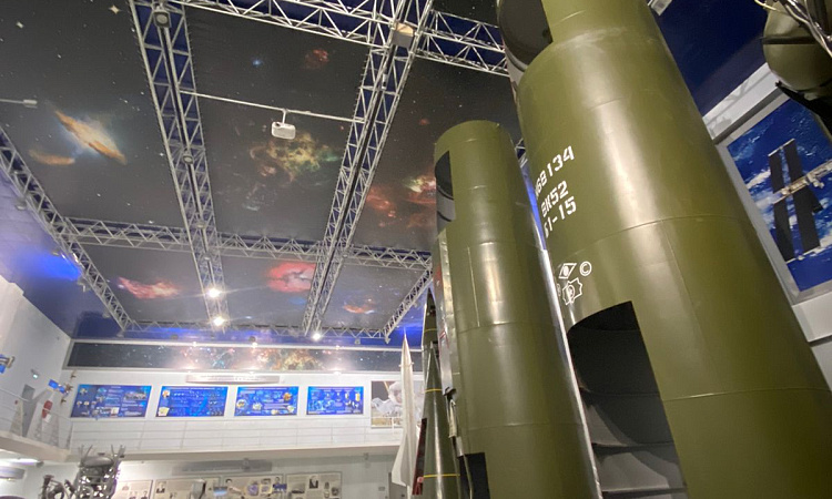 Ребята посетили зал "Пилотируемой космонавтики" и зала "Ракетно-космической техники". В зале "Ракетно-космической техники" представлены экспонаты в натуральную величину - ракетные двигатели, космические антенны, камера сгорания маршевого двигателя РД 216, модуль полезной нагрузки спутника "Экспресс 4М44". зенитная ракета В 750 для поражения высотных воздушных целей. В центре зала стоят манекены, демонстрирующие тренировочные костюмы кандидатов в экипаж Международной космической станции.