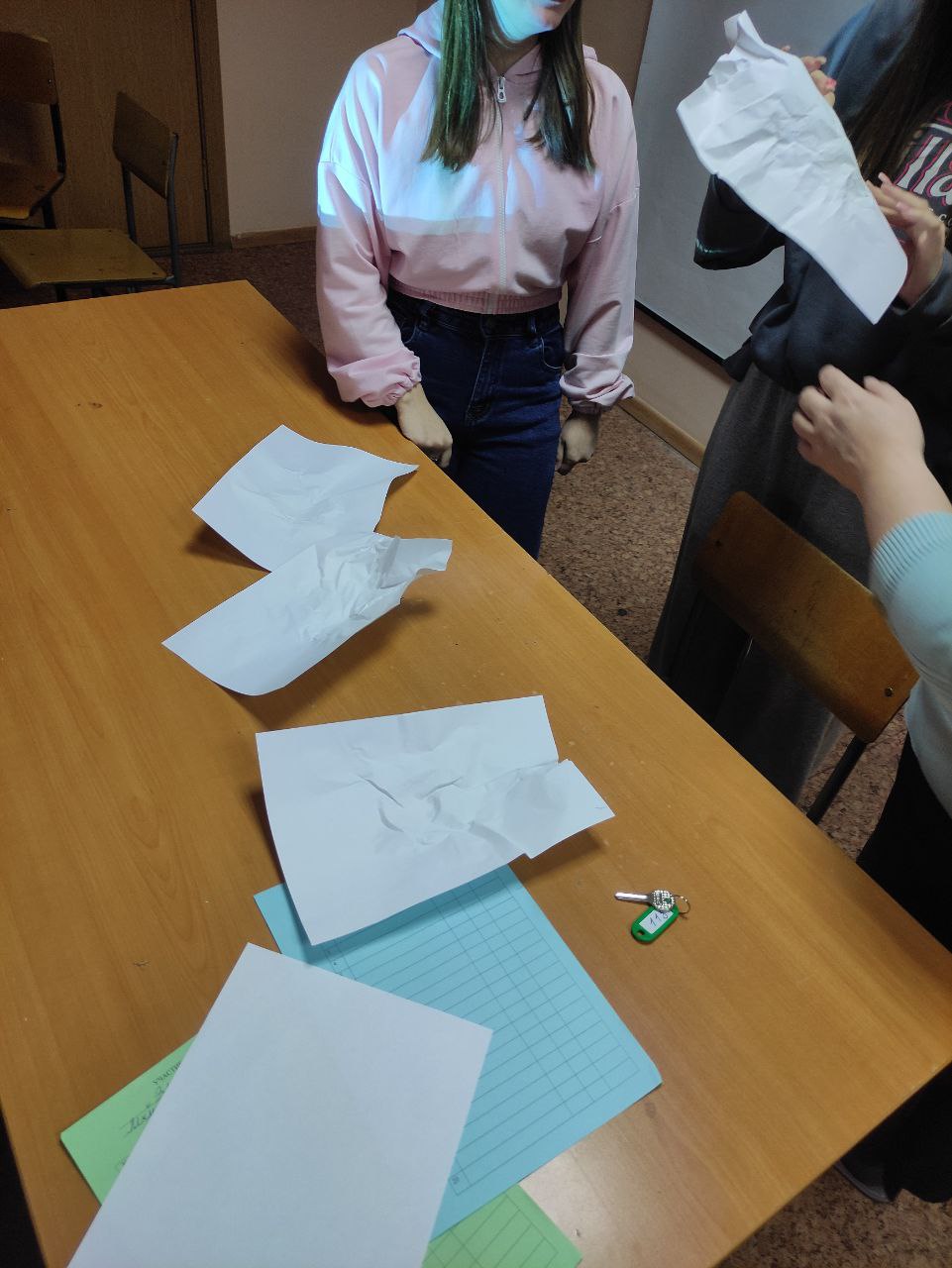 Пробовали энергетически прочувствовать состояние участников по упражнению «Маска» и опознать их. Маской был обычный белый лист бумаги, которым продавили лицо, придав листу форму лица. Отчасти и это упражнение нашло правильные варианты описания.