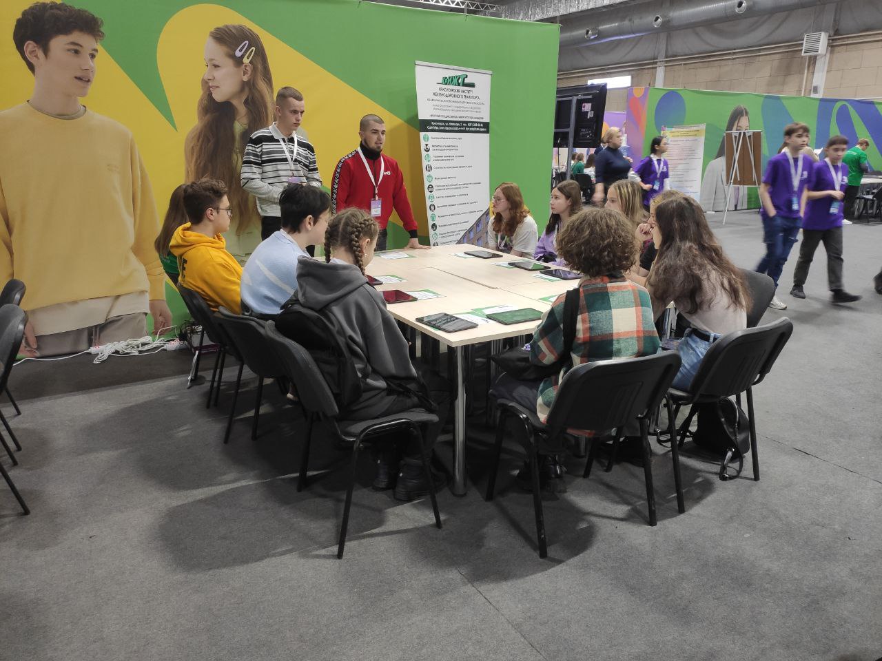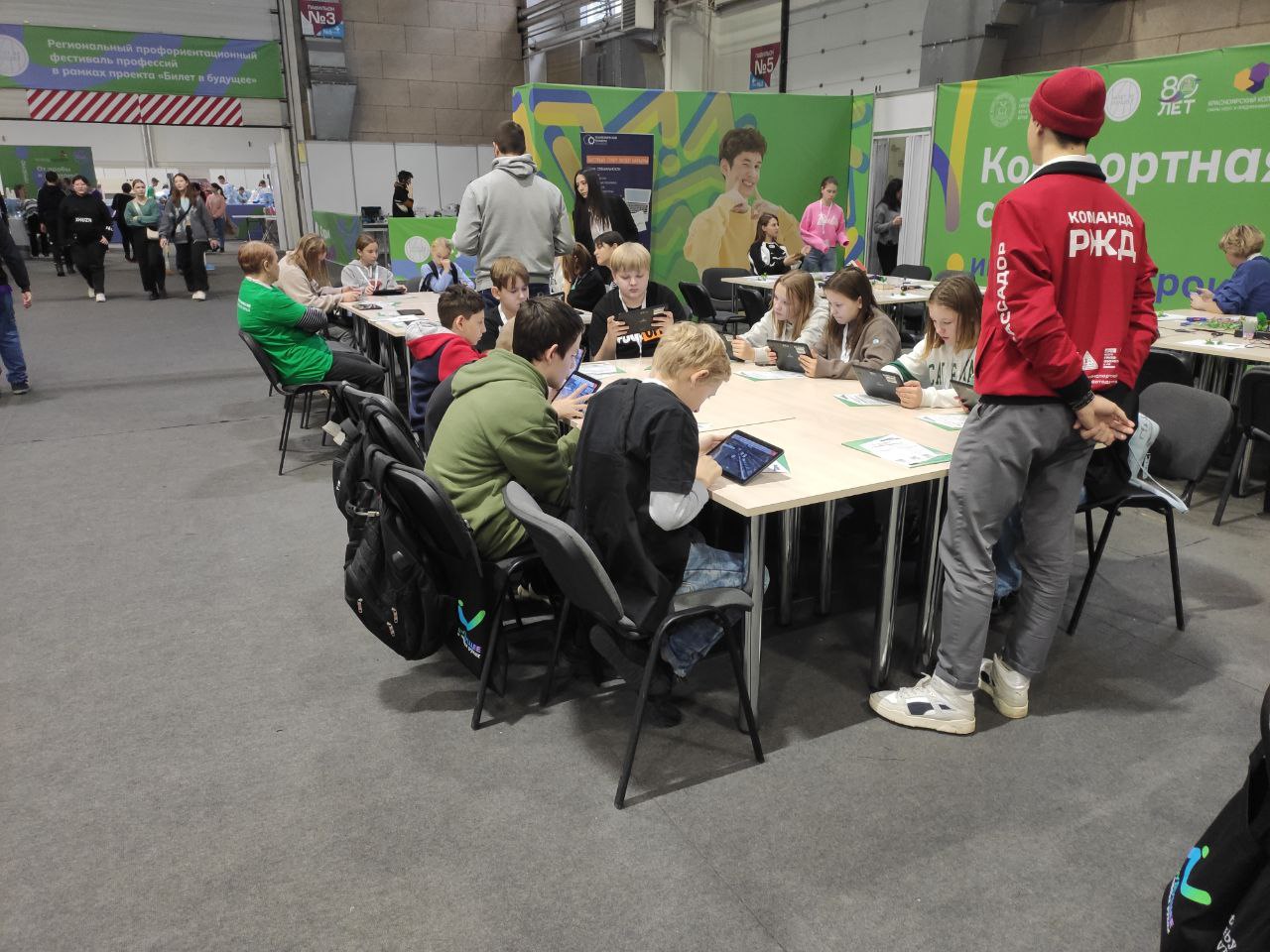 А с 9 по 11 ноября в рамках "Билета в будущее" проходил "Фестиваль профессий" в МВДЦ "Сибирь". За три дня фестиваль посетило более тысячи школьников Красноярского края. Каждый день гости мероприятия проходили профессиональные пробы, в том числе организованные Красноярским институтом железнодорожного транспорта. На этих пробах мы погружали школьников в железнодорожную профессию через приложение-симуляцию на планшетах, на которой был отражен полный рабочий процесс разгрузки цистерны с нефтью, начиная от выбора средств индивидуальной защиты работника, заканчивая химической пробой образца нефти. Очень гордимся тем, что это обучающее приложение полностью разработано работником КрИЖТ - Евгением Бойковым (p.s. если хотите научиться разрабатывать приложения, то можно записаться к Евгению Викторовичу в его технологические кружки).