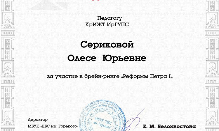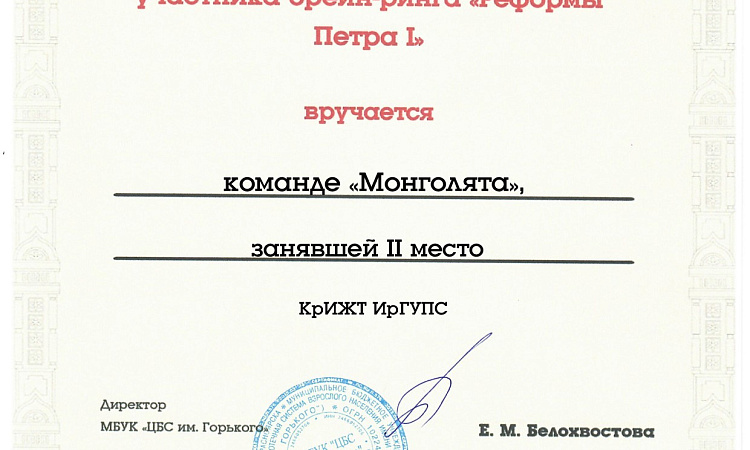 28.11.2022 в Центральной городской библиотеке им. А.М. Горького команда из студентов 1 курса КрИЖТ ИрГУПС кафедры «Управление персоналом» (руководитель - старший преподаватель Серикова О.Ю.) заняла 2 место среди участвующих команд , в интеллектуальная игре брейн-ринг «Реформы Петра I», приуроченный к 350-летию со дня рождения великого реформатора.