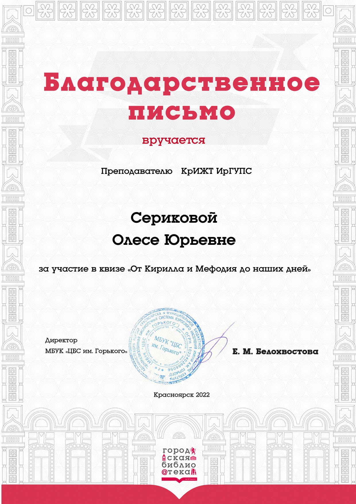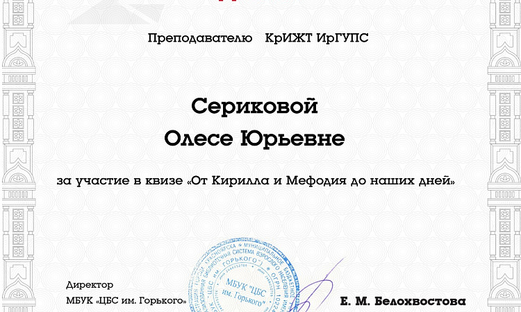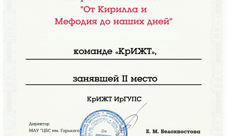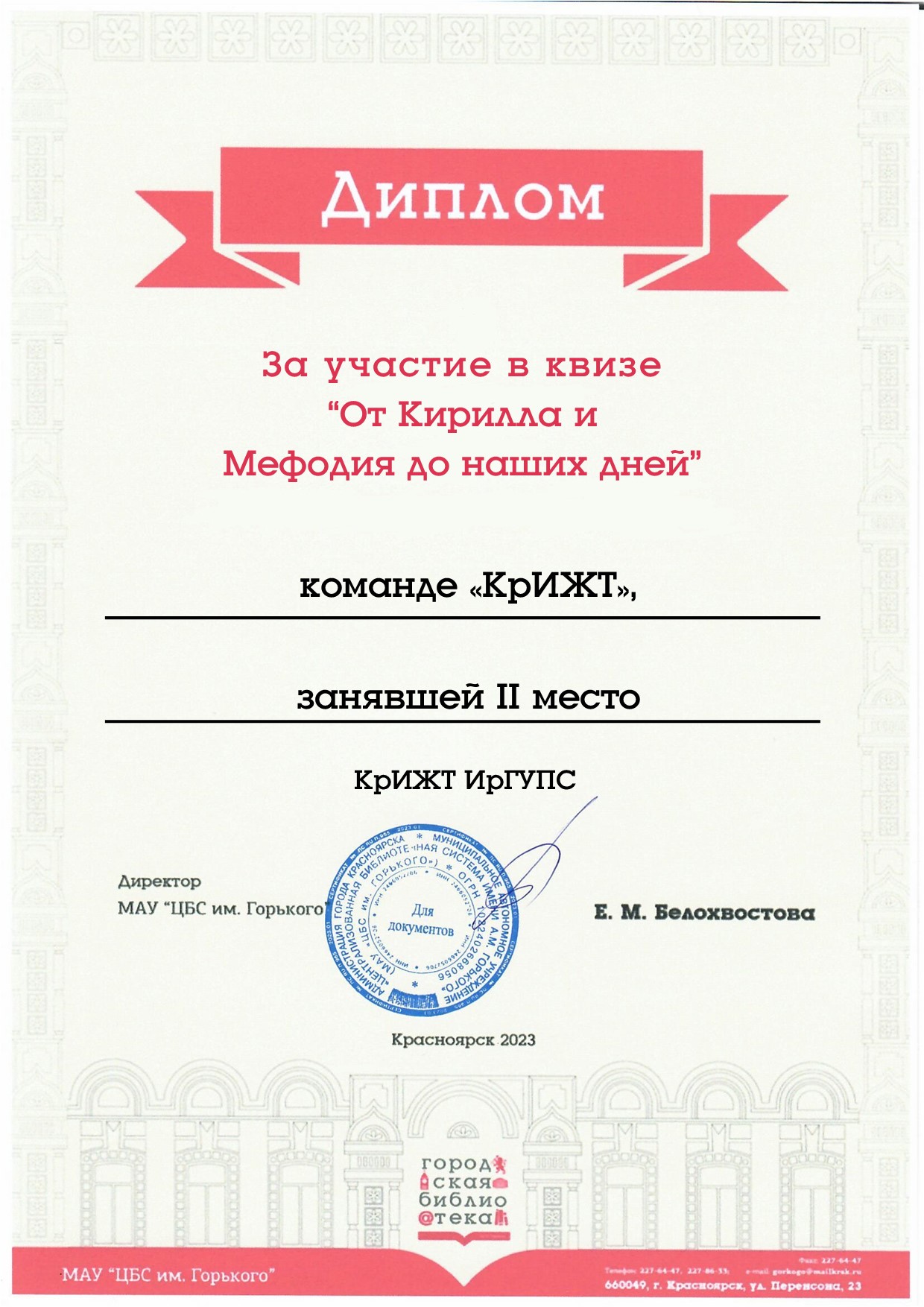14 марта в Центральной городской библиотеке им. А.М. Горького студенты КрИЖТ ИрГУПС гр. Э-22-1 кафедры "Управление персоналом" (руководитель команды старший преподаватель Серикова О.Ю.) приняли участие в интеллектуальном квизе «От Кирилла и Мефодия до наших дней», посвящённый истории русского языка.