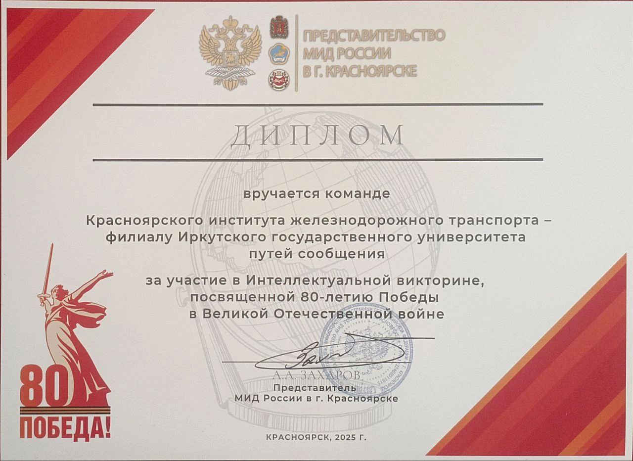 Команда Красноярского института железнодорожного транспорта продемонстрировала свои знания истории Великой Отечественной войны, приняв участие в масштабной викторине, посвященной 80-летию Великой Победы. Мероприятие, организованное представительством МИД РФ в г. Красноярске, собрало эрудированные команды из 14 ведущих вузов Красноярского края, а также представителей других стран, что подчеркивает международное значение исторической памяти о событиях тех лет.
