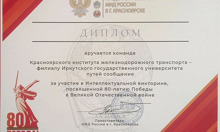 Администрация КрИЖТ выражает благодарность представительству МИД РФ в г. Красноярске за проведение столь значимого и важного мероприятия, объединившего студенческую молодежь в стремлении познавать историю своей страны. Подобные инициативы играют важную роль в формировании гражданской позиции и воспитании патриотизма у будущих специалистов.