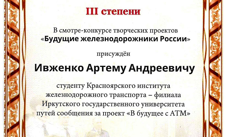 По итогам III (заключительного) этапа ДИПЛОМ III степени получил студент Красноярского техникума железнодорожного транспорта Ивженко Артем Андреевич за проект «В будущее с АТМ», который разработал под руководством преподавателя СПО Филипповой Надеждой Георгиевной. Артем обучается на четвертом курсе на специальности 27.02.03 Автоматика и телемеханика на транспорте (железнодорожном транспорте).