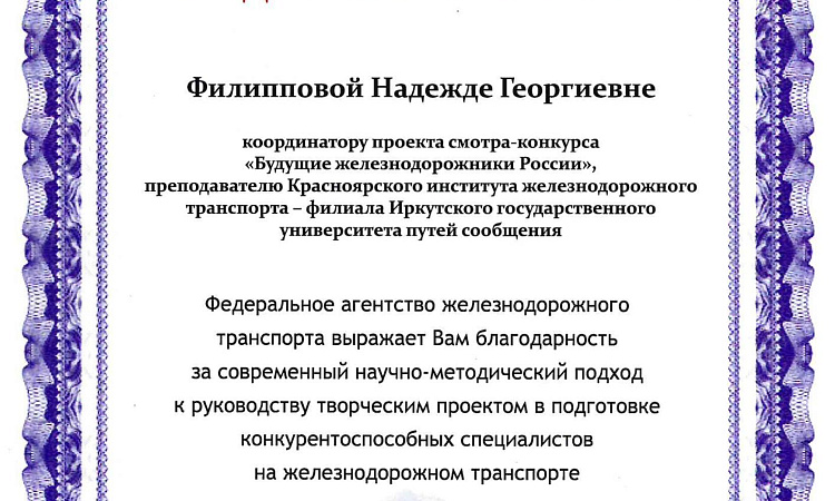 Федеральным Агентством железнодорожного транспорта в текущем году был объявлен смотр – конкурс творческих проектов «Будущие железнодорожники России» среди обучающихся железнодорожных специальностей по образовательным программам среднего профессионального образования. Конкурс проходил в три этапа.