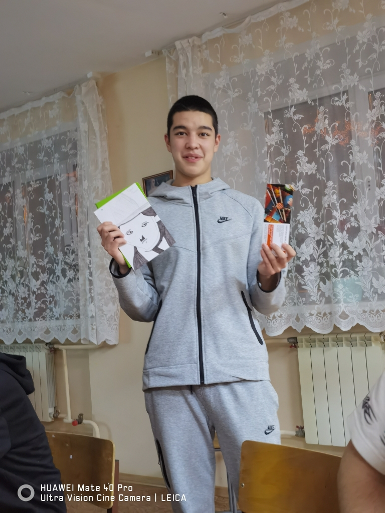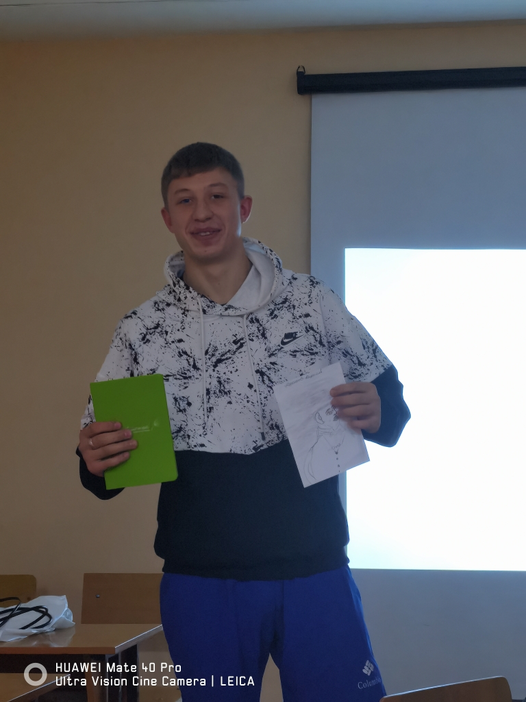 В финале мероприятия лучшие работы были отмечены не только аплодисментами, но и призами. Лукьянов Измаил получил за первое место записную книжку и сертификат на пиццу в размере 1000 рублей. Тюмереков Дмитрий выиграл записную книжку и два сертификата на дизайнерский урок. Маренков Кирилл занял третье место и получил записную книжку.
