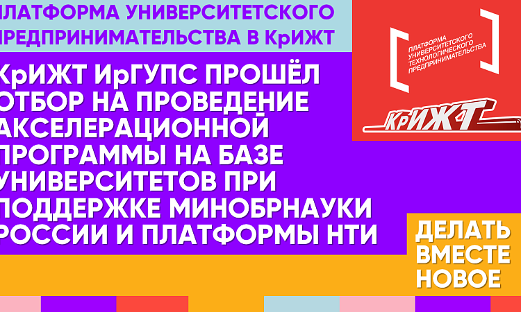 КрИЖТ ИрГУПС прошёл отбор среди 166 российских организаций, подавших заявки на проведение акселерационной программы на базе университетов при поддержке МИНОБРНАУКИ России и платформы НТИ. КрИЖТ выступит организатором акселерационной программы в рамках федерального проекта «Платформа университетского технологического предпринимательства».