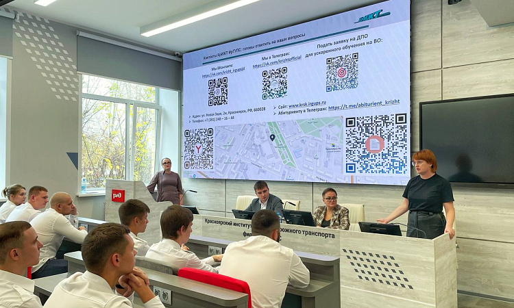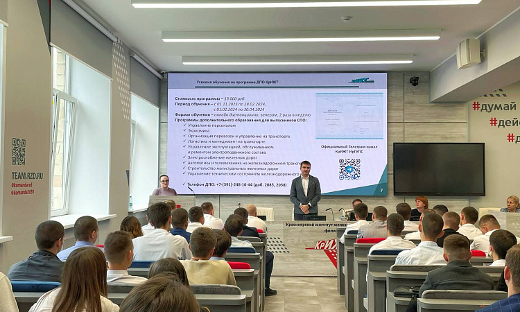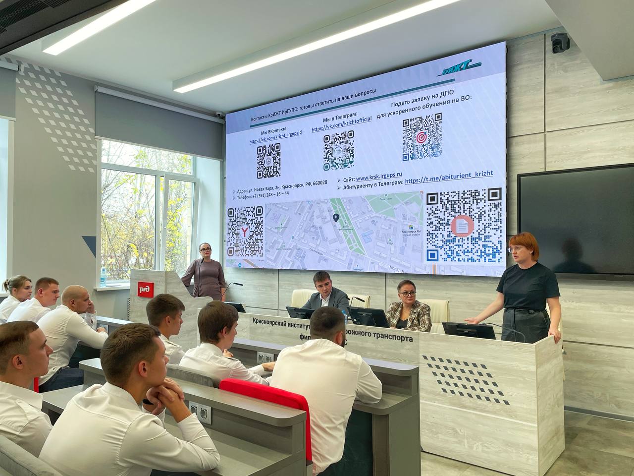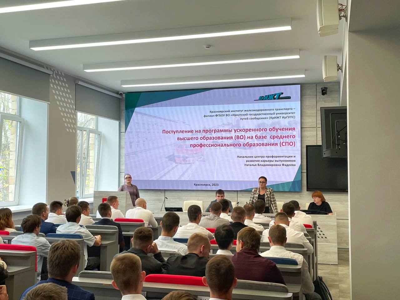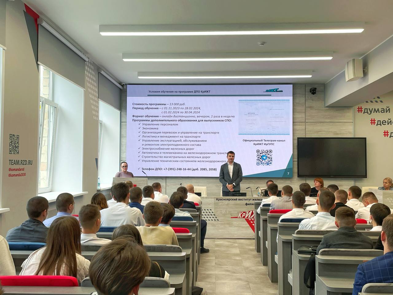 18 октября прошел открытый диалог со студентами выпускного курса СПО специальности «Техническая эксплуатация подвижного состава железных дорог (локомотивы)» с представителями высшего образования КрИЖТ. В диалоге учувствовали заместитель директора по СПО Елена Смиян, начальник ЦПРК Наталья Фадеева, и.о. зав. каф. «Эксплуатация железных дорог» Вячеслав Томилов, и.о. декана факультета заочного отделения Кутузова А.В.