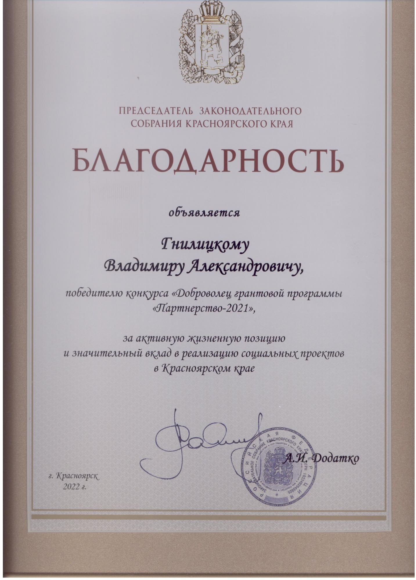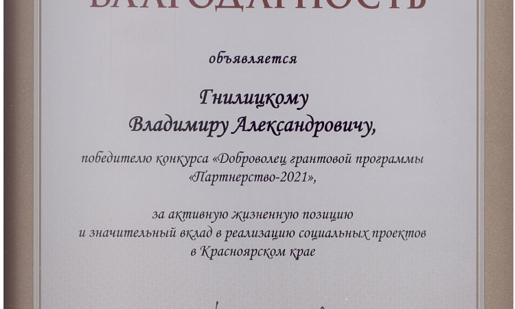 28 октября в Краевом дворце молодежи прошло торжественное награждение победителей конкурса на присуждение премии «Доброволец грантовой программы «Партнёрство-2021». По итогам заседания экспертного совета были определены 20 победителей, среди которых студент Красноярского техникума железнодорожного транспорта КрИЖТ ИрГУПС группы Д 9-19-1 Владимир Гнилицкий. Владимир награжден за весомый волонтерский вклад в реализацию социального проекта «Отрыв от цивилизации» в 2021 году и награжден премией в 10000 рублей. Поздравляем и желаем новых успехов!