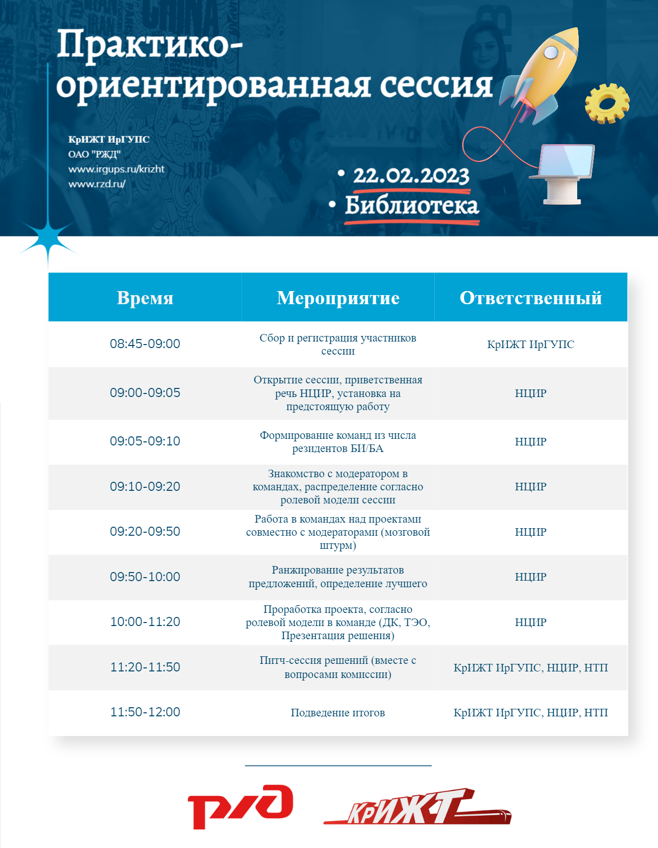 22 февраля в 9.00 региональный центр инновационного развития КрИЖТ приглашает Вас посетить и принять участие в "Практико-ориентированной сессии" организованной совместно с Красноярской железной дорогой. Ждём Вас на мероприятии в библиотеке.