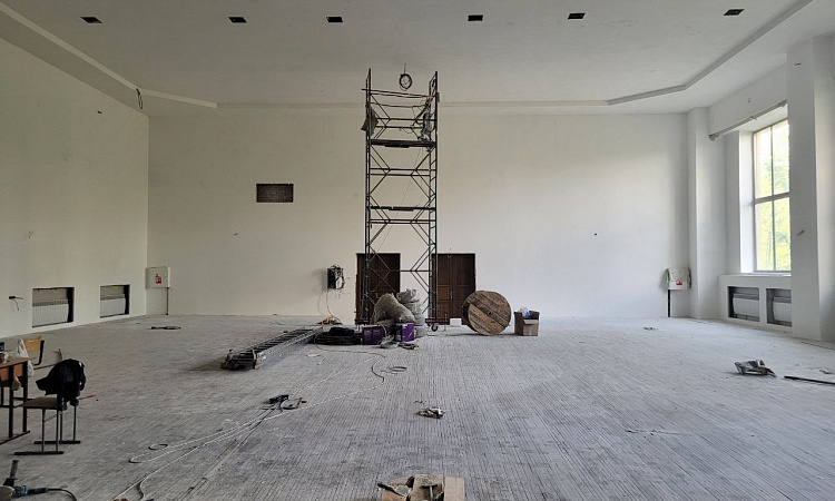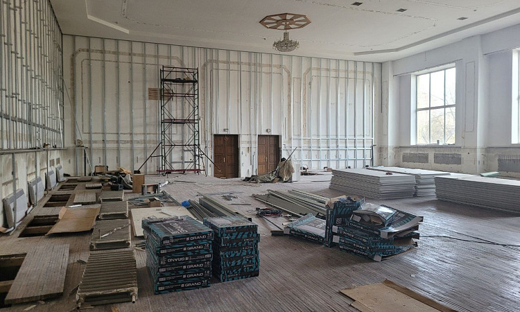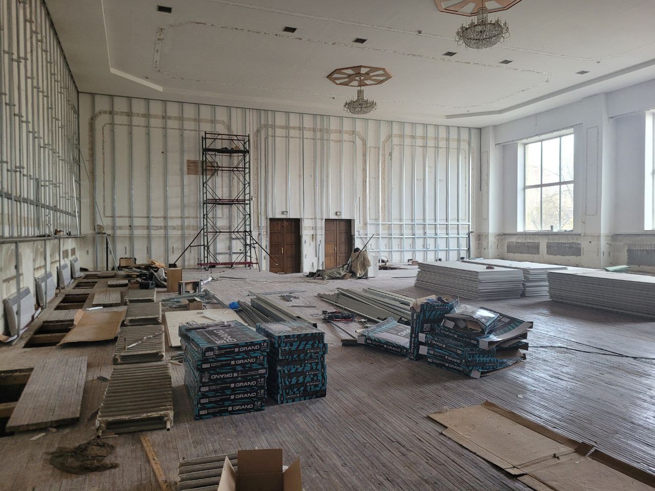 В настоящее время выполнены работы по обшивке стен и колонн гипсокартонными листами, установлены радиаторы отопления, что обеспечит комфортную температуру в помещении во время проведения мероприятий. Подготовлены стены под окраску, это придаст залу свежий и современный вид.