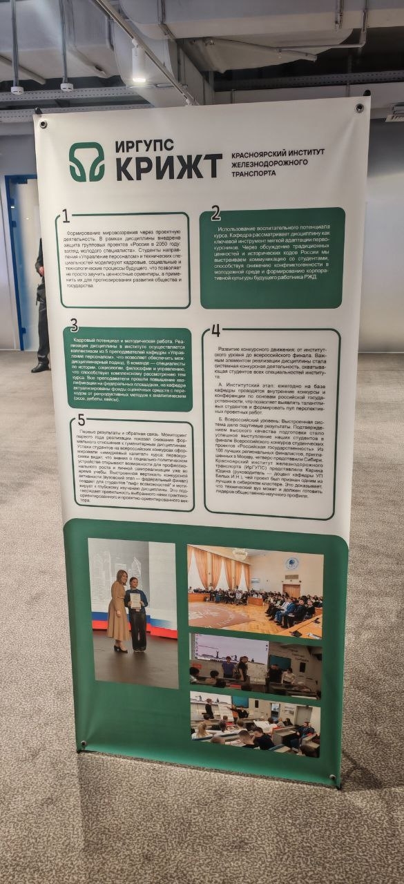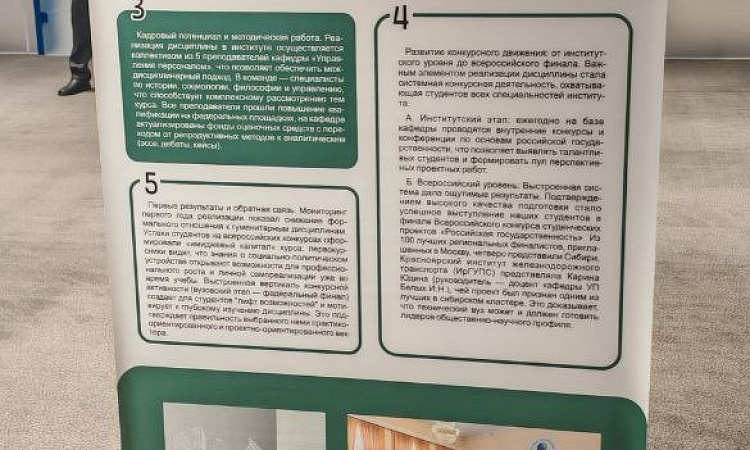 Участие в постерной сессии позволило не только продемонстрировать наработки КрИЖТ, но и получить экспертную оценку федеральных специалистов проекта «ДНК России». По итогам конференции полученные методические материалы и новые контакты будут использованы для дальнейшего совершенствования учебного процесса.