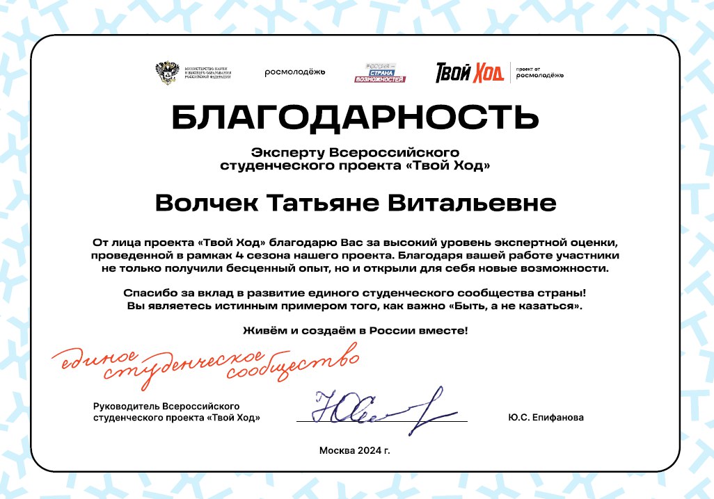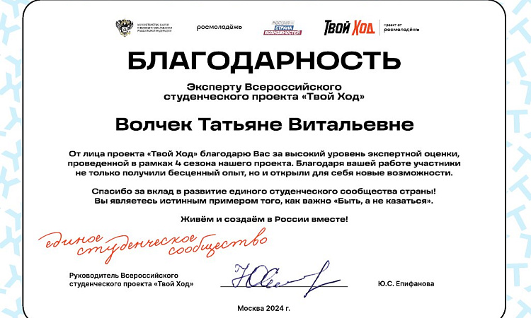 Альбину Данилову, декана факультета очного обучения и Волчек Татьяну, доцента кафедры ЭЖД, которые в 2024 году выступили в роли экспертов Всероссийского студенческого проекта "Твой ход" в 2024 году!