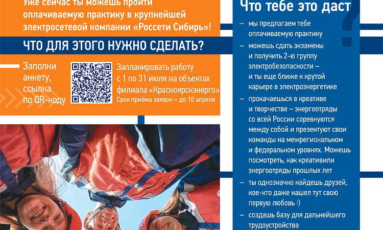 Информируем Вас о том что в 2024 году продолжает реализовываться проект по организации оплачиваемой летней практики студентов в Энергоотрядах филиала ПАО "Россети Сибирь"- "Красноярскэнерго" в период с 01 по 31 июля 2024 года.
