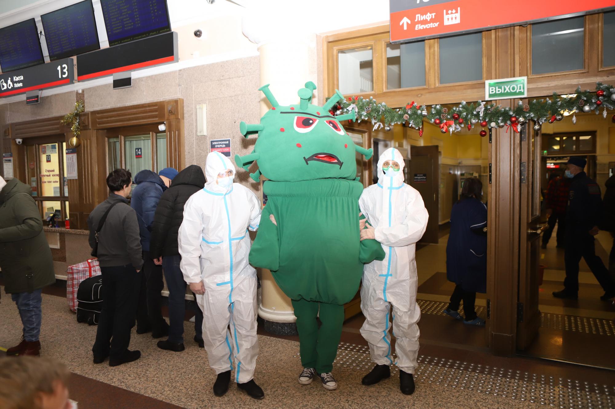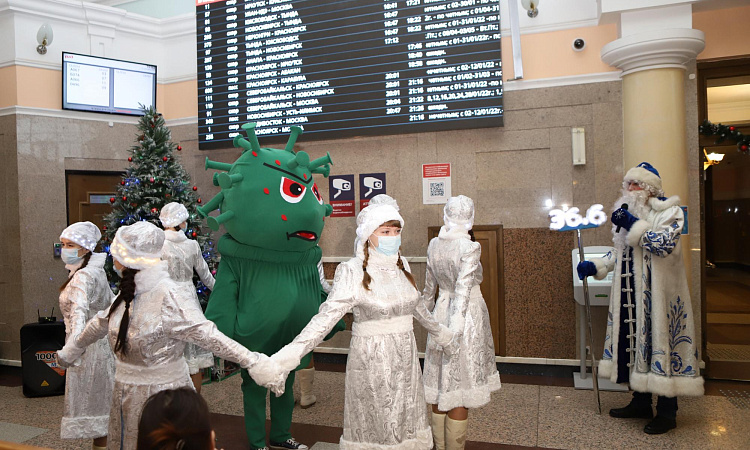 Дед Иммунитет (Дед Мороз) и его помощницы Внучки-антитела (Снегурочки) поздравили с наступающим Новым годом посетителей вокзала Красноярск.