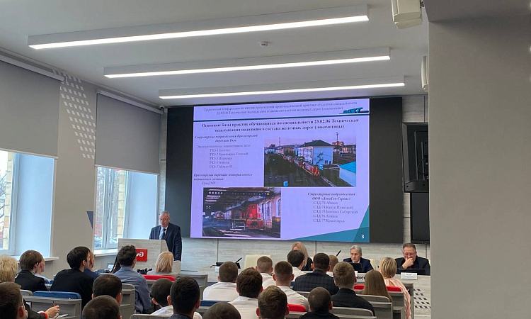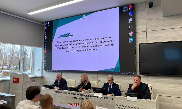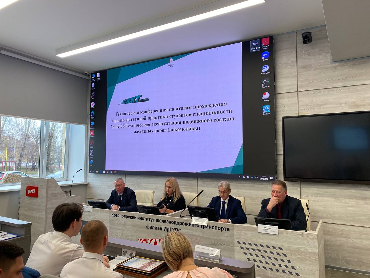 31 октября в КрИЖТ ИрГУПС прошла техническая конференция, посвященная итогам прохождения производственной практики на специальности "Техническая эксплуатация подвижного состава железных дорог (локомотивы)", в которой приняли участие студенты второго и третьего курса, руководители производственной практики от техникума, заведующий отделением «Электромеханическое» Алена Ворошилова, заместитель директора по развитию и связям с производством Алексей Орленко и представители работодателя: заместитель начальника Красноярской дирекции моторвагонного подвижного состава по кадрам и социальным вопросам Виктор Данько; заместитель начальника по управлению персоналом сервисного локомотивного депо Красноярск ООО «Локотех-сервис» Ольга Власенко; заместитель начальника Эксплуатационного локомотивного депо Красноярск-Главный по кадрам и социальным вопросам Наталья Сургутская.