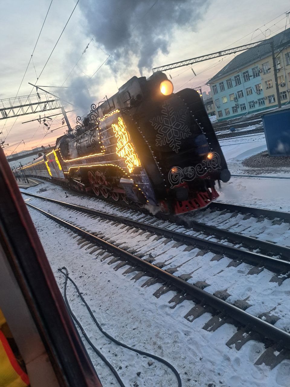 Особенно впечатляет паровоз П36. Это настоящий шедевр послевоенной инженерной мысли. Несмотря на украшения из новогодней атрибутики, он всё же напоминает военный поезд. Паровоз очень быстрый и не уступает современным тепловозам на перегонах, как рассказал машинист. А гудок паровоза — это просто песня! Когда он звучит, перрон словно окутывается паром, будто мы вернулись в 1953 год, когда этот паровоз был ещё нужен. Котёл паровоза топят углём, который берут из тендера, прицепленного к нему.