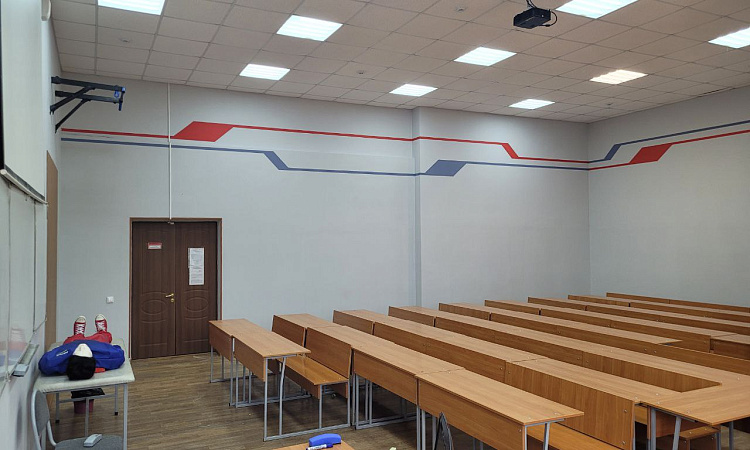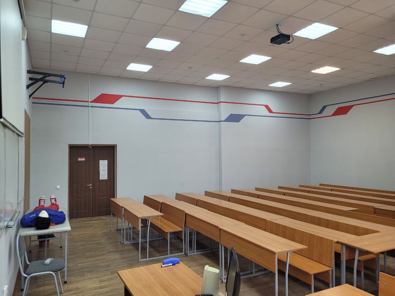 Одним из главных изменений аудитории — это цветовое решение стен. Теперь они окрашены в благородный серый цвет, который придает помещению элегантность и спокойствие. Серый — это универсальный цвет, который не вызывает излишнего напряжения и не отвлекает внимание, позволяя студентам лучше сконцентрироваться на учебе. Психологически серый ассоциируется с интеллектом, стабильностью и профессионализмом, что способствует созданию подходящей образовательной атмосферы.