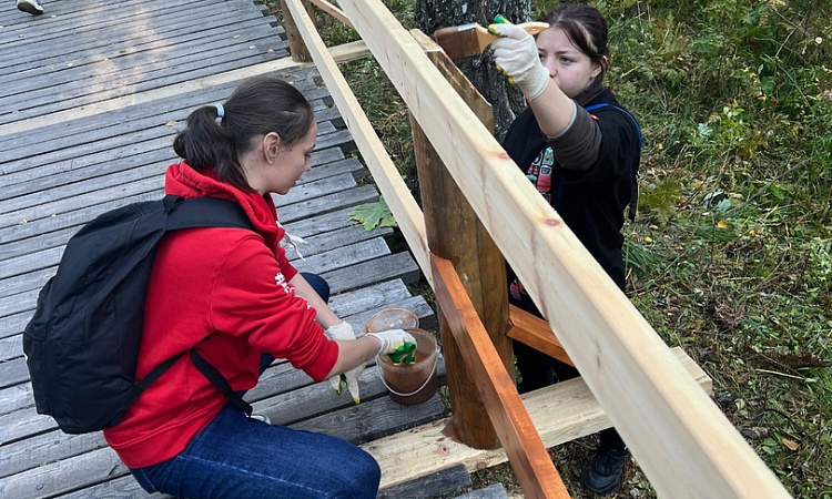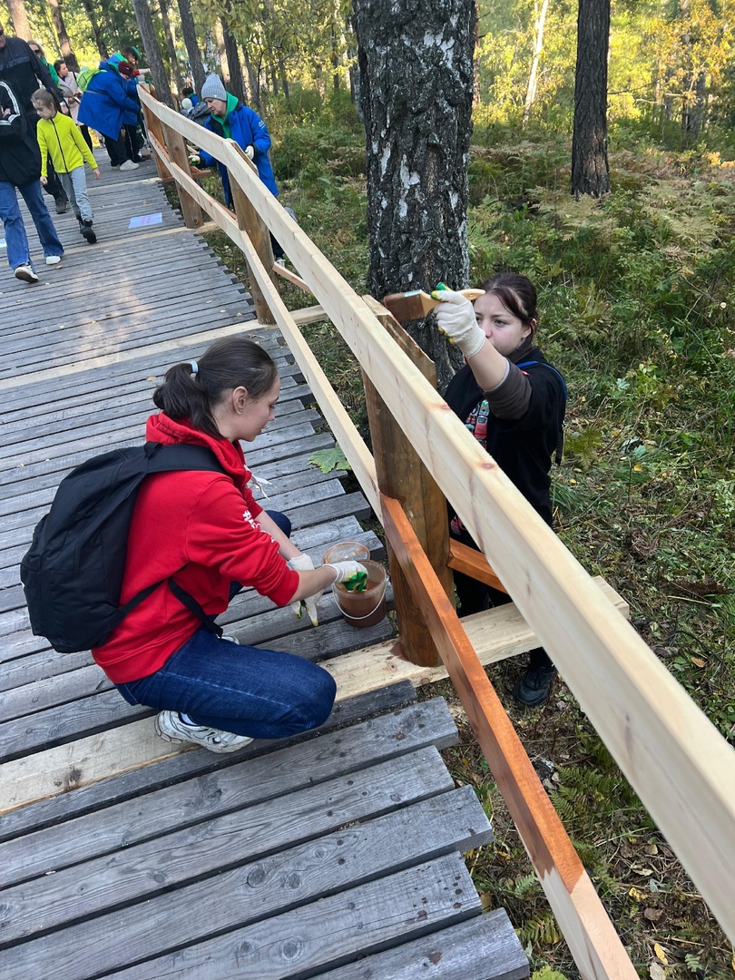 Также команда волонтеров помогла национальному парку «Красноярские столбы», перенести материалы для постройки лестницы к верхней части площадки, покрасить новые ступеньки для устойчивости и долгосрочного использования материала.
