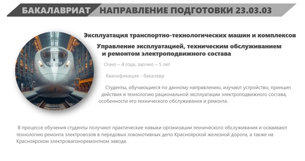 Направление подготовки 23.03.03 «Эксплуатация транспортно-технологических машин и комплексов» входит в приоритетные направления развития науки, технологий и техники в Российской Федерации.