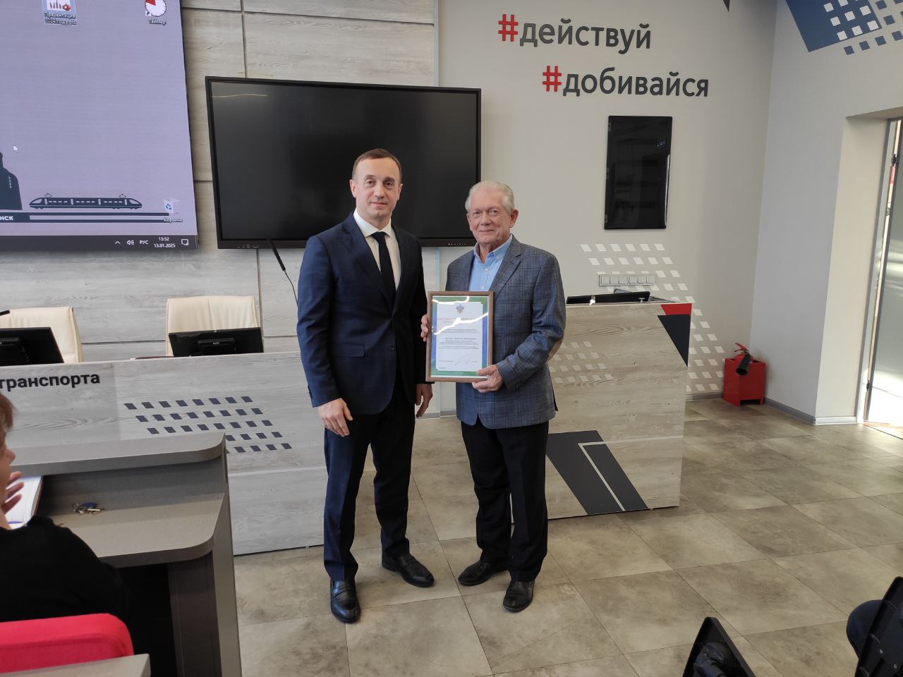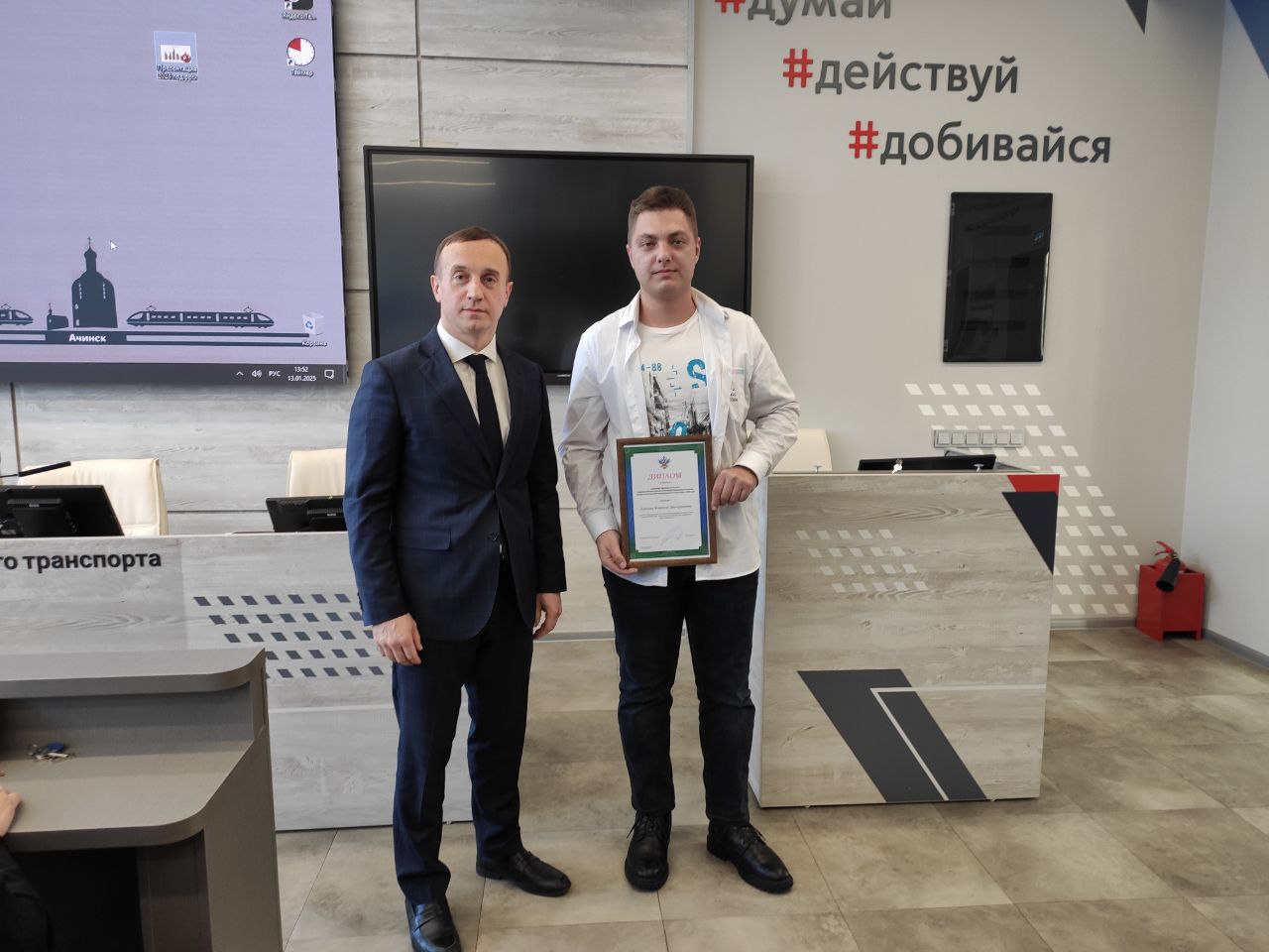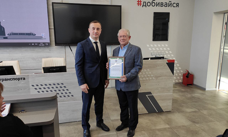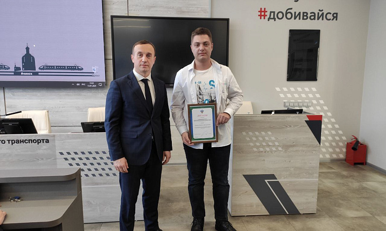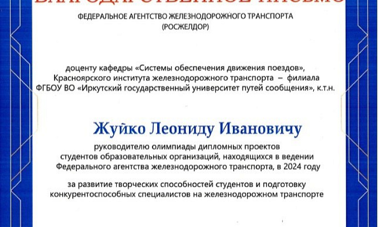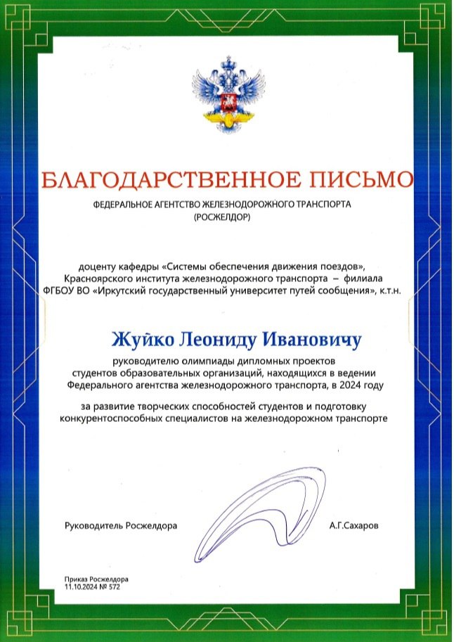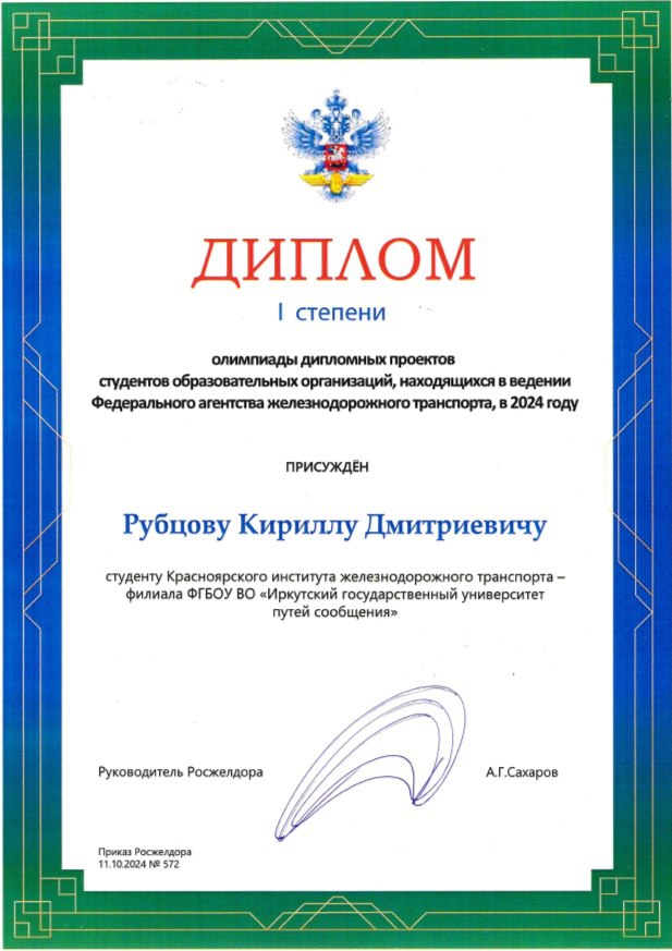В соответствии с приказом Росжелдора от 11.10.2024 № 572 наш студент удостоен диплома 1 степени, а его руководитель – благодарственным письмом. Награды вручены в торжественной форме директором КрИЖТ ИрГУПС Евгением Савченко.