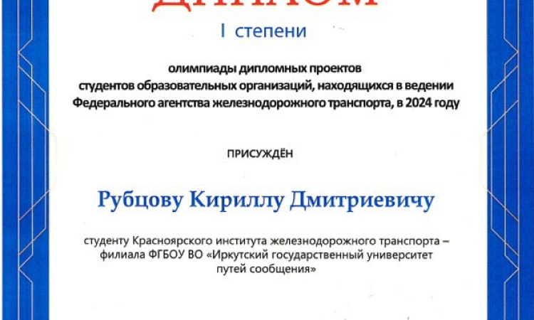 Поздравляем с заслуженной победой в «Олимпиаде дипломных проектов» студентов образовательных организаций, находящихся в ведении Федерального агентства железнодорожного транспорта, в 2024 году» по специальности «Системы обеспечения движения поездов» выпускника Кирилла Рубцова и его дипломного руководителя – доцента кафедры «СОД» Леонида Жуйко.
