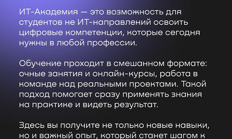 Познакомиться со всеми программами и подать заявку можно на сайте ИТ-Академии. (https://it-hub.tusur.ru/academy/programs)