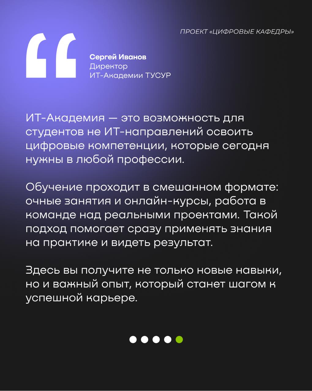 В ИТ-Академии ТУСУР студенты не ИТ-специальностей могут получить новые цифровые компетенции, усилить свою основную профессию и расширить возможности для будущей карьеры. Обучение стартует во второй половине октября и будет длиться 1 учебный год (до июля 2026 г.). Прием заявок до 13.10.