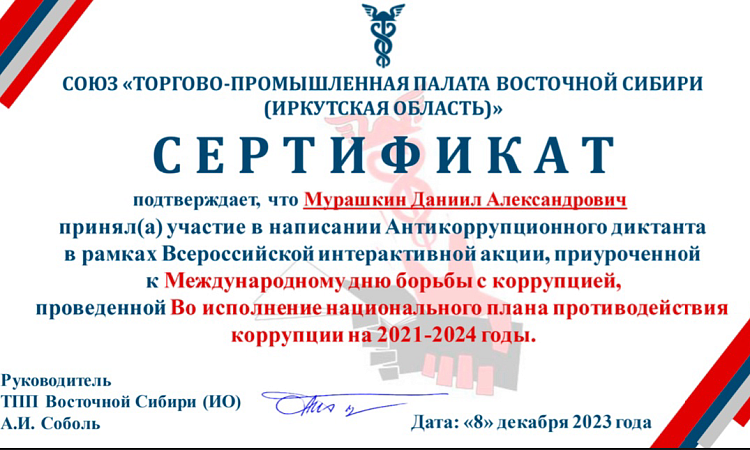 В рамках Акции были представлены итоги XI этапа специального исследования Торгово-промышленной палаты РФ «Бизнес-Барометр Коррупции», а также проведен антикоррупционный диктант, который позволил своим участникам проверить свои знания в сфере антикоррупционного законодательства и антикоррупционной политики. Студенты получили сертификаты участия в Акции.