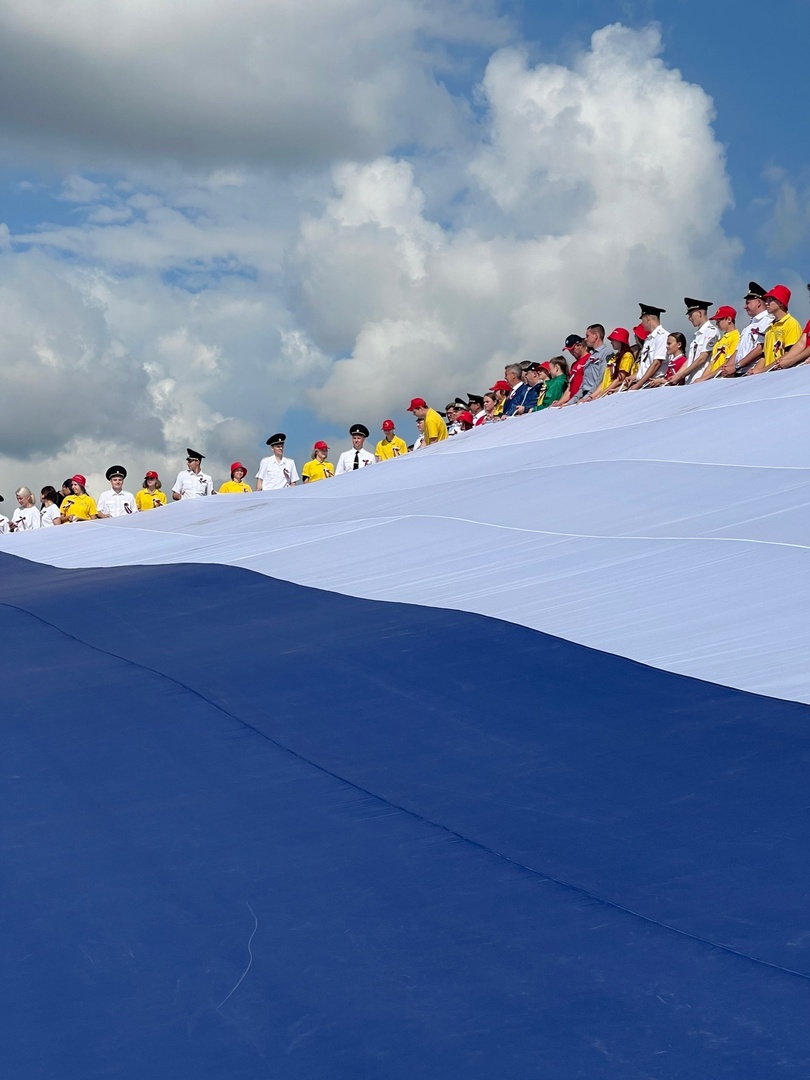 Единовременно полотно держал около 90 человек, а сам процесс был сопровожден музыкальной композицией «Флаг моего государства» в живом исполнении Ансамбля ГУ МВД по краю «Голоса Енисея».