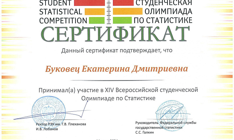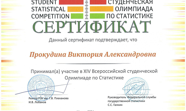 За успешное представление докладов на конкурс научных работ и прохождение отборочного этапа, команда КрИЖТ отмечена сертификатами участников и благодарственным письмом директору КрИЖТ от руководителя Федеральной службы по статистике и ректора Российского экономического университета им. Г.В. Плеханова.