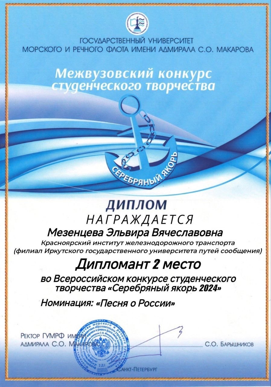 Вокалисты Красноярского института железнодорожного транспорта приняли участие в ежегодном конкурсе студенческого творчества «Серебряный якорь 2024» организатором которого является ФГБОУ ВО «ГУМРФ имени адмирала С. О. Макарова».
