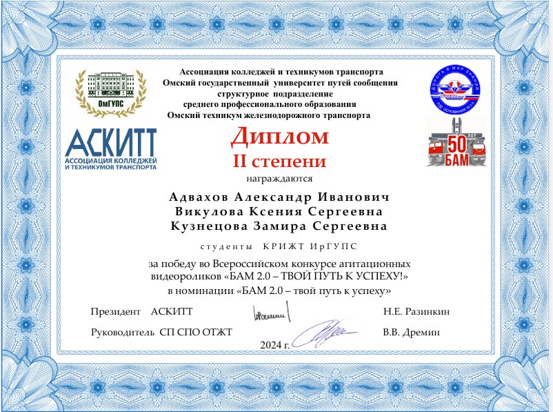 Поздравляем студентов группы М 9-22-1 с заслуженным вторым местом во Всероссийском конкурсе агитационных видеороликов «БАМ 2.0-Твой путь к успеху!»