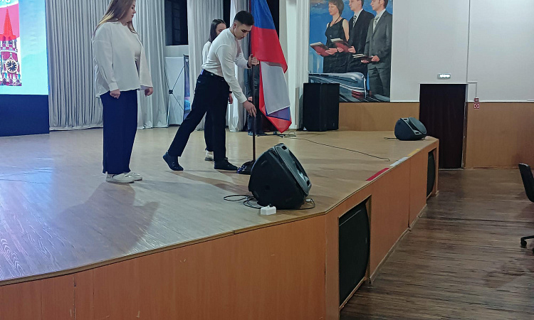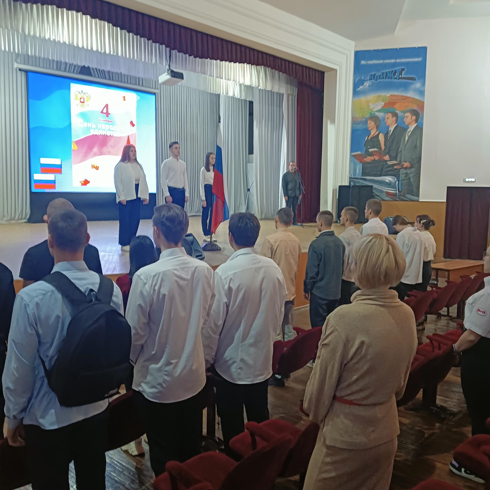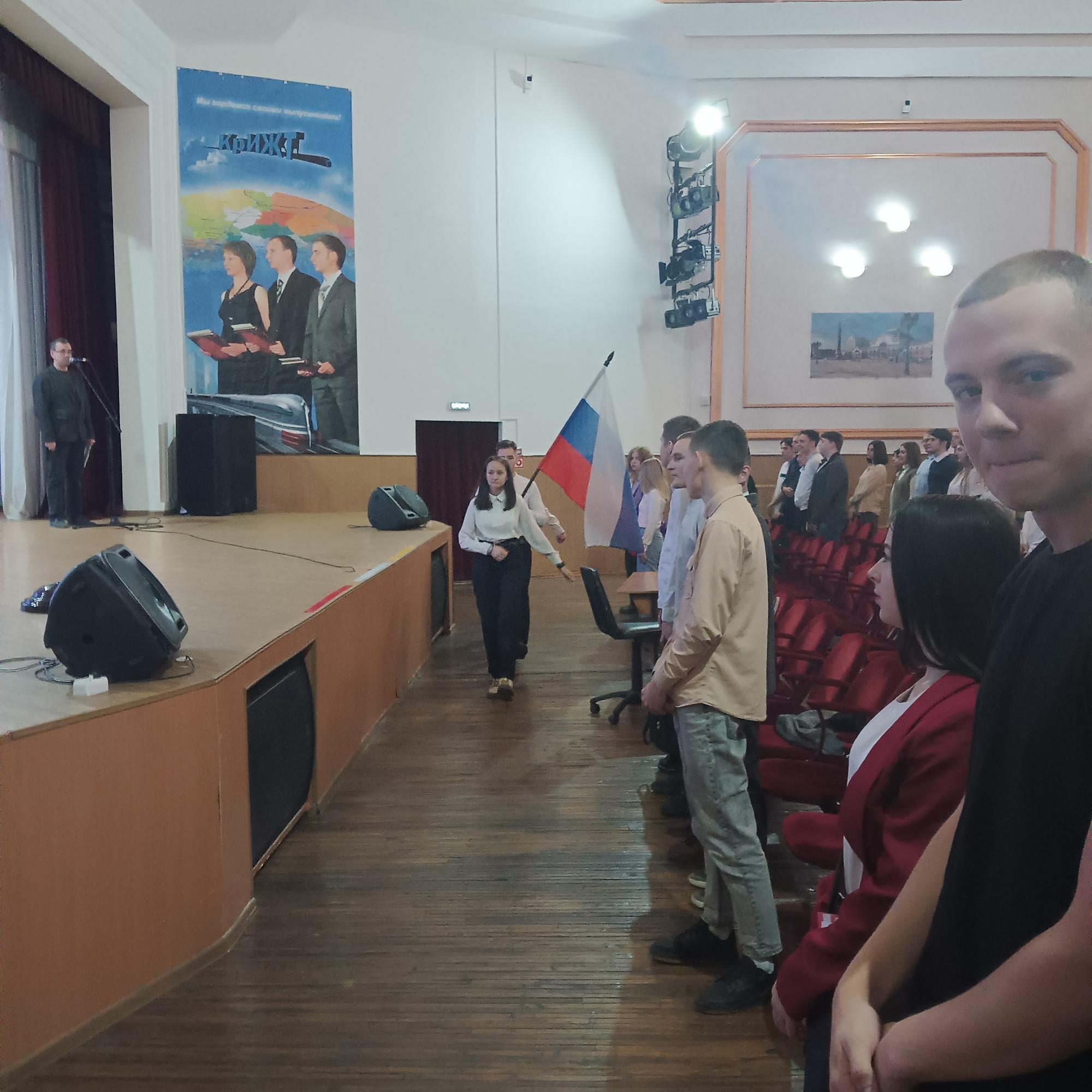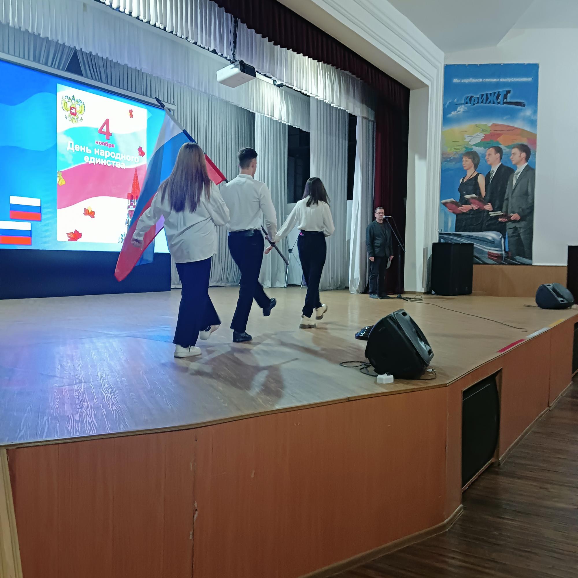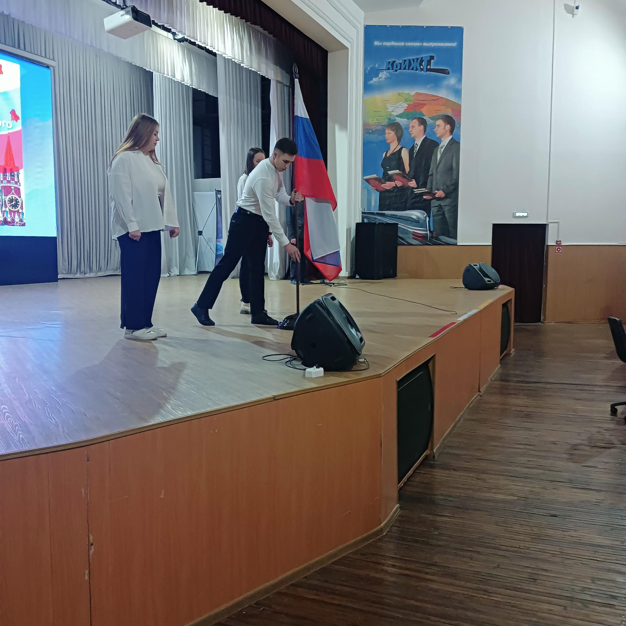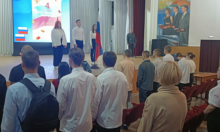 30 октября 2023 года в Красноярском техникуме железнодорожного транспорта КрИЖТ ИрГУПС вынос флага Российской Федерации и разговоры о важном состоялись в актовом зале и были посвящены предстоящему празднованию Дня народного единства.