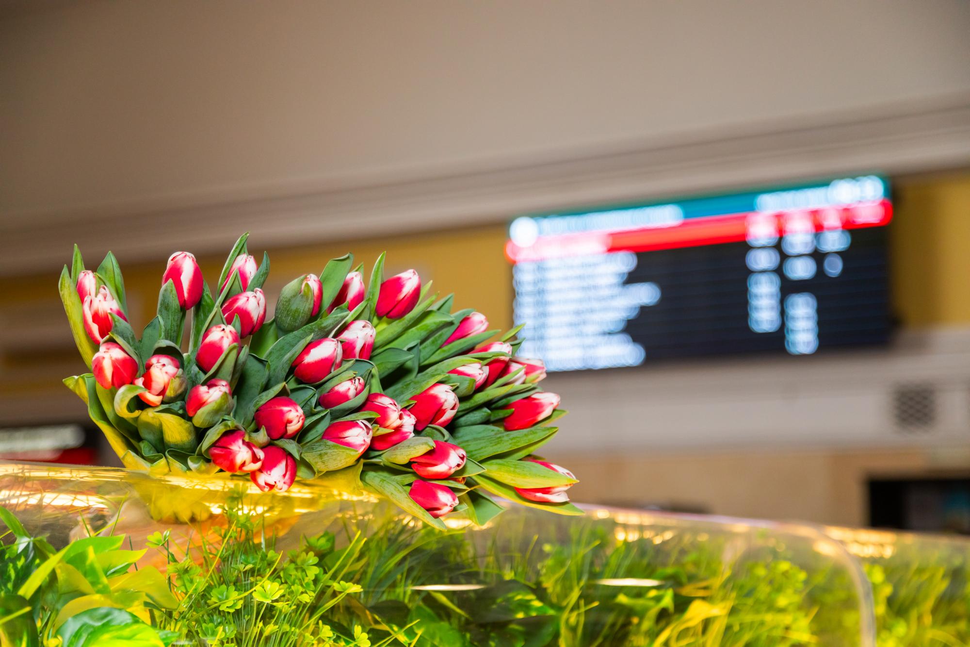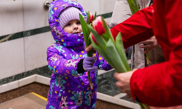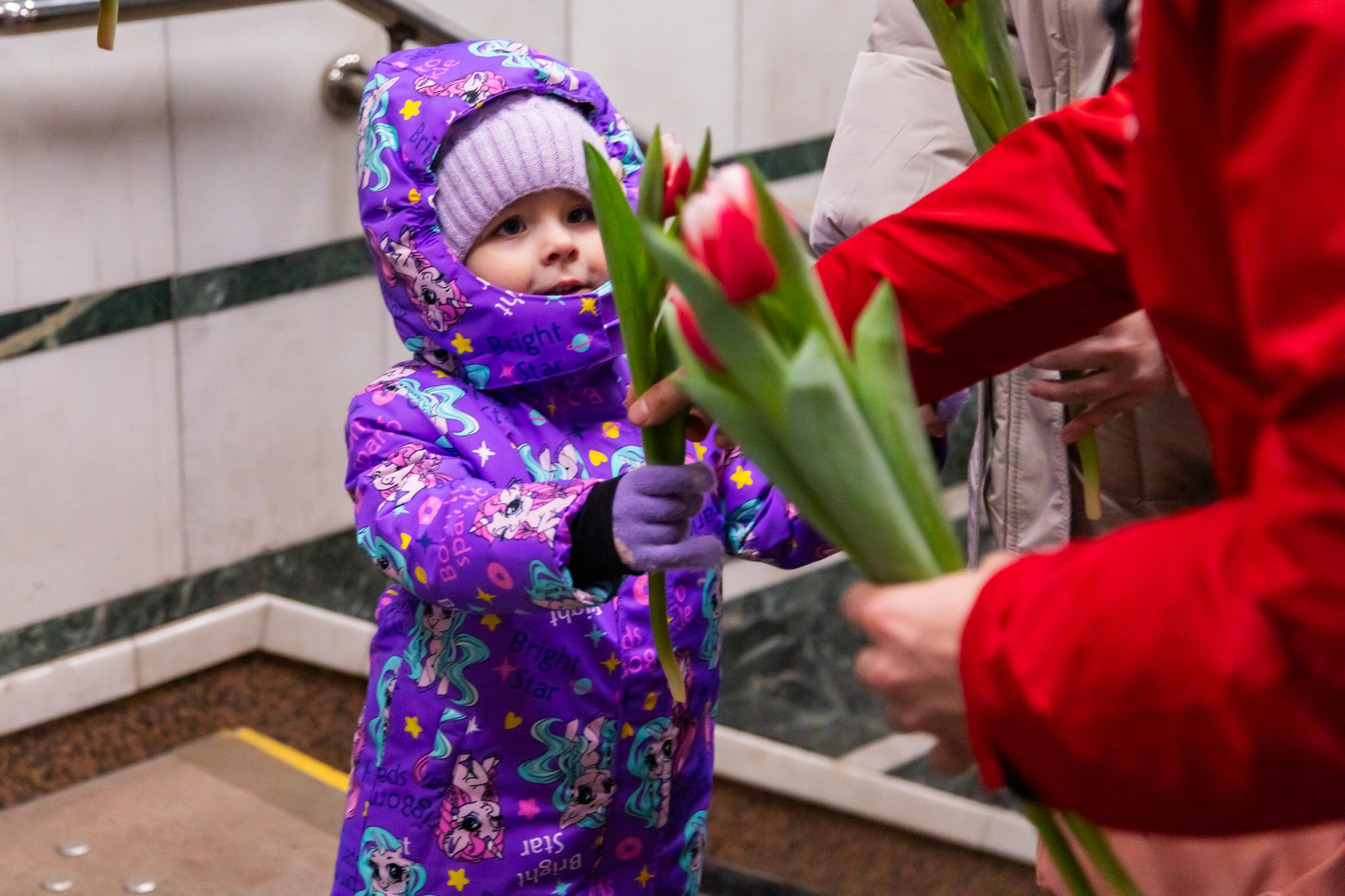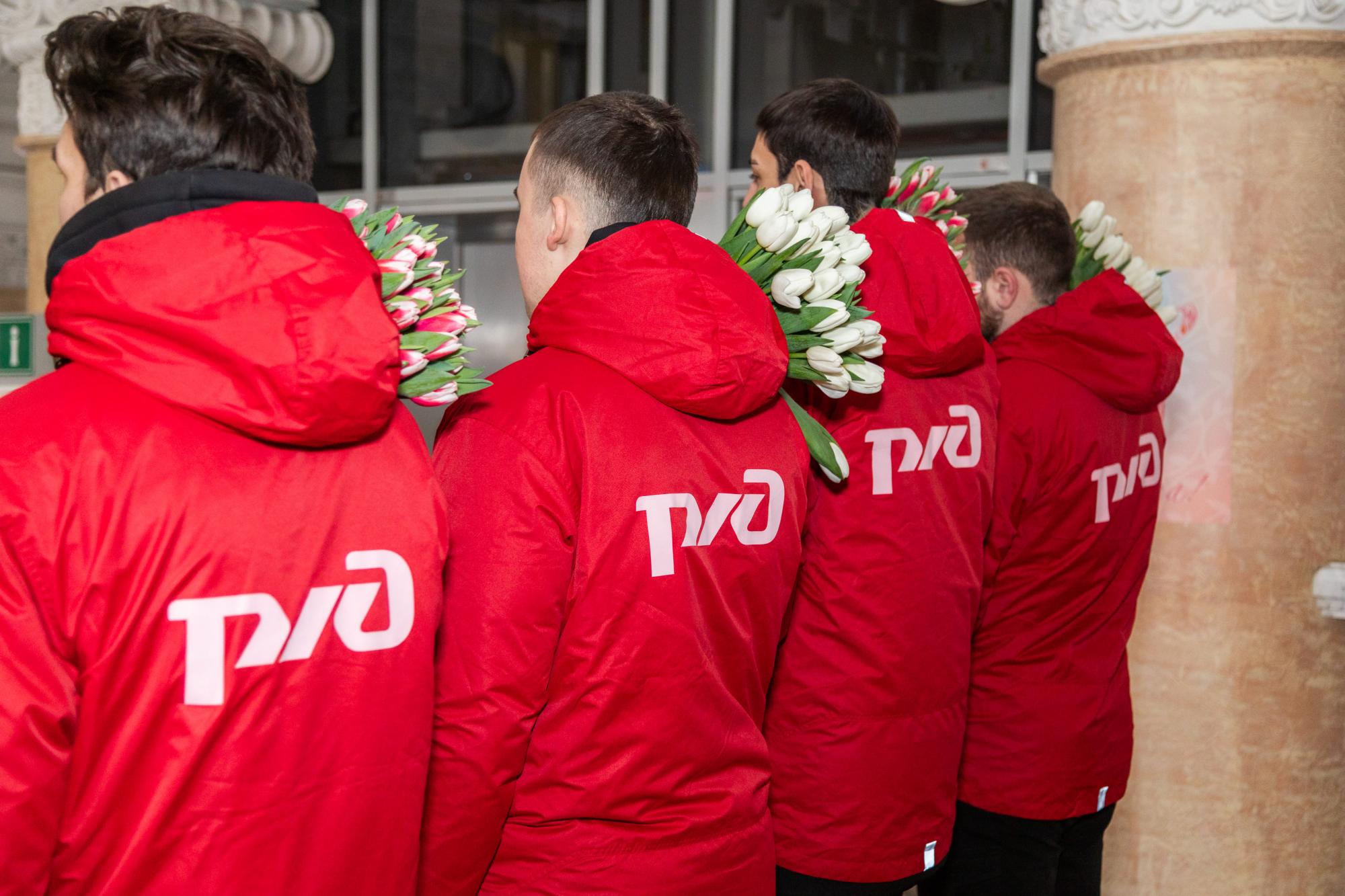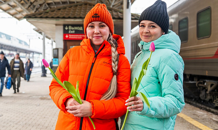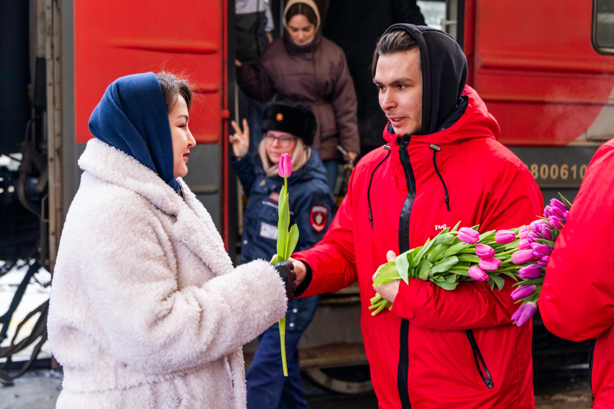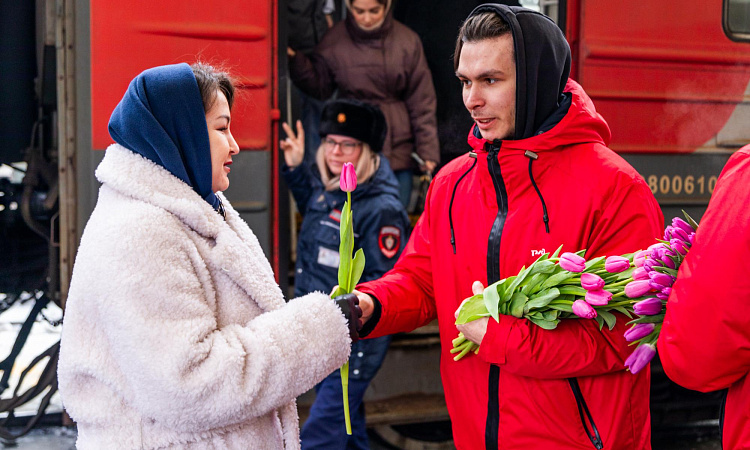 Молодые люди поздравили с Международным женским днем представительниц прекрасной половины человечества, отправляющихся в путешествие на поезде или возвращающихся из поездки. Они подарили пассажирам тюльпаны, которые ассоциируются с приходом весны.