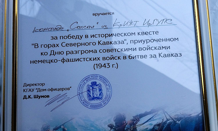 Студенты 1 курса Красноярского техникума железнодорожного транспорта КрИЖТ ИрГУПС группы Д 9-22-1. приняли участие 19 октября 2022 года между командами г. Красноярска в военно – патриотическом квесте «В горах Северного Кавказа» посвященного Дню разгрома советскими войсками немецко-фашистских войск в битве за Кавказ (1943 г.) организованным Краевым государственным автономным учреждением «Дом офицеров».