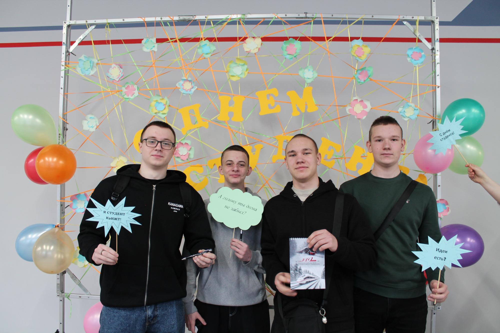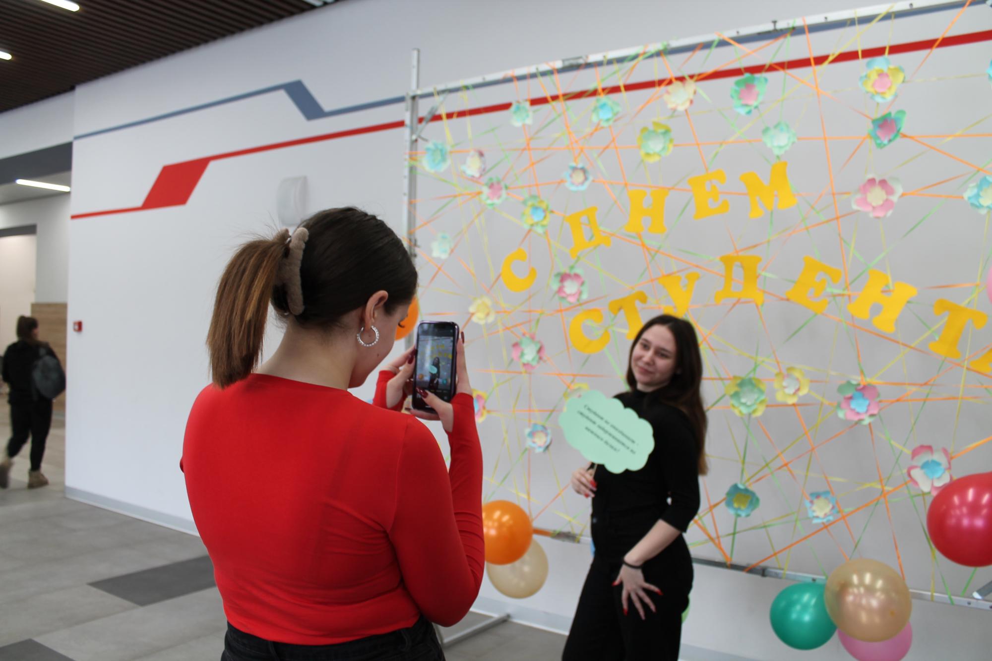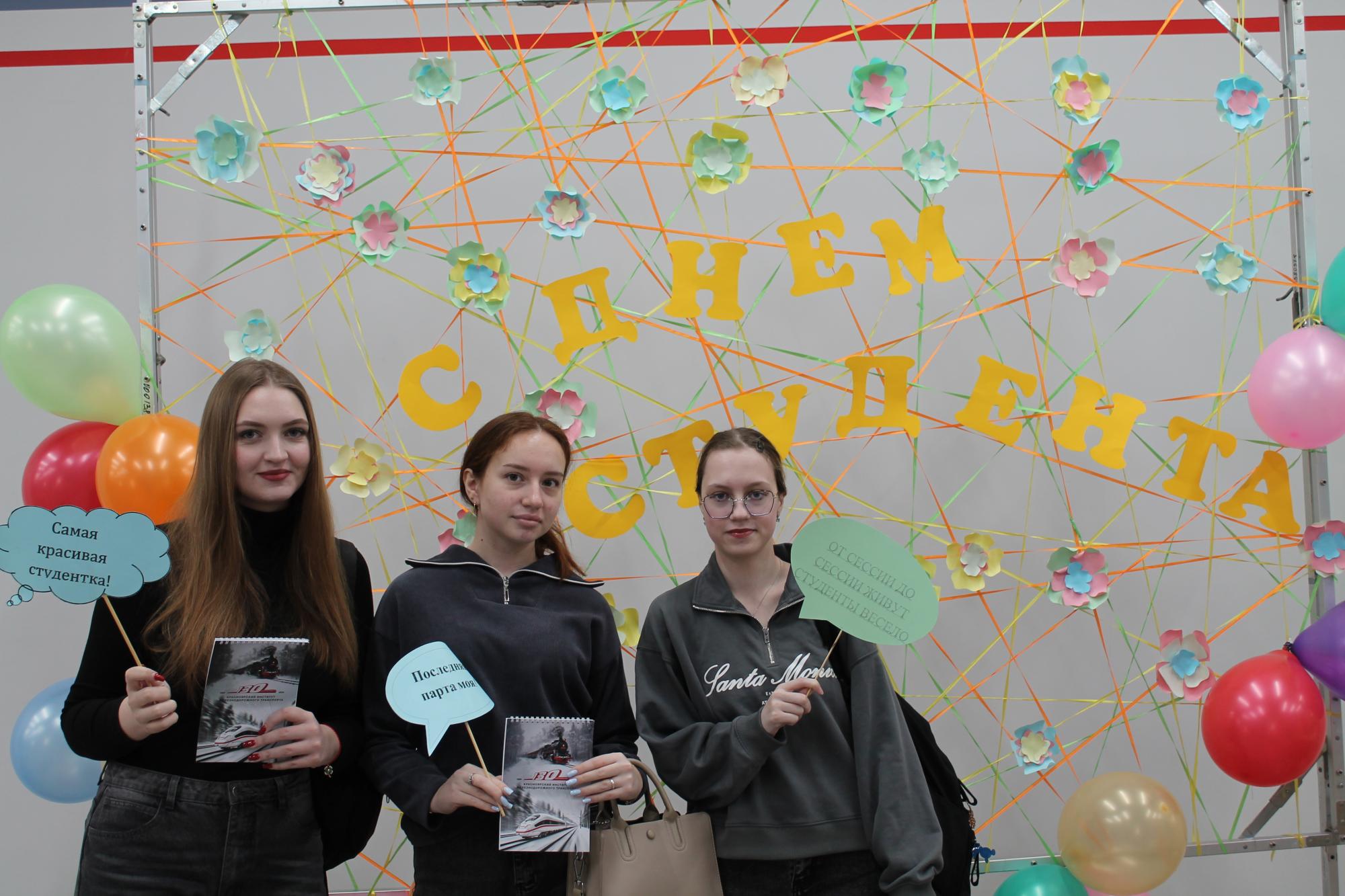 Для студентов КрИЖТ был подготовлен не только праздничный концерт с различными номерами и поздравлениями, но и оборудована специальная фотозона. В сопровождении музыки студенчества прошла акция «Лови момент», где обучающие должны были пройти небольшой тест и беспроигрышно получить приз!
