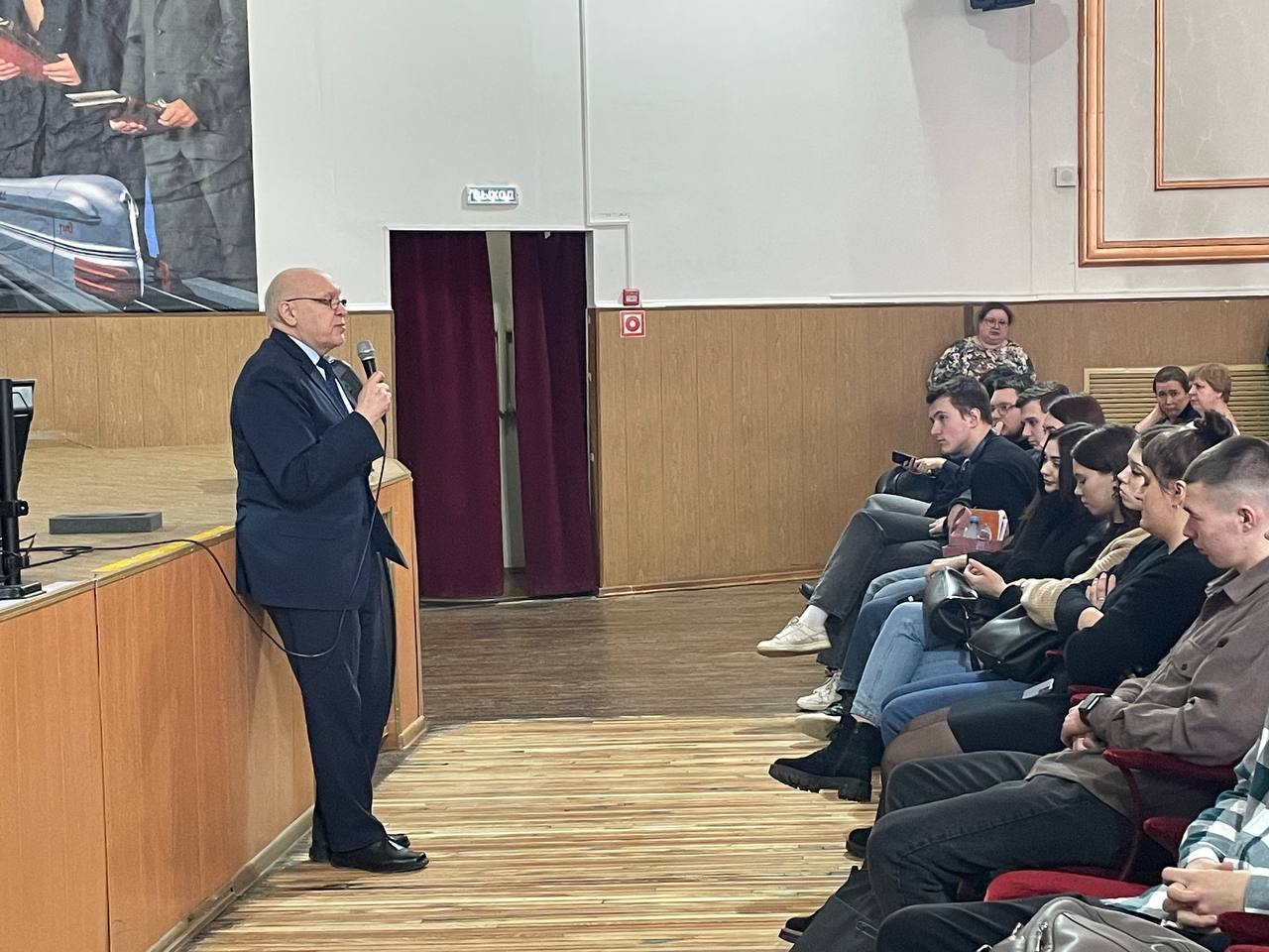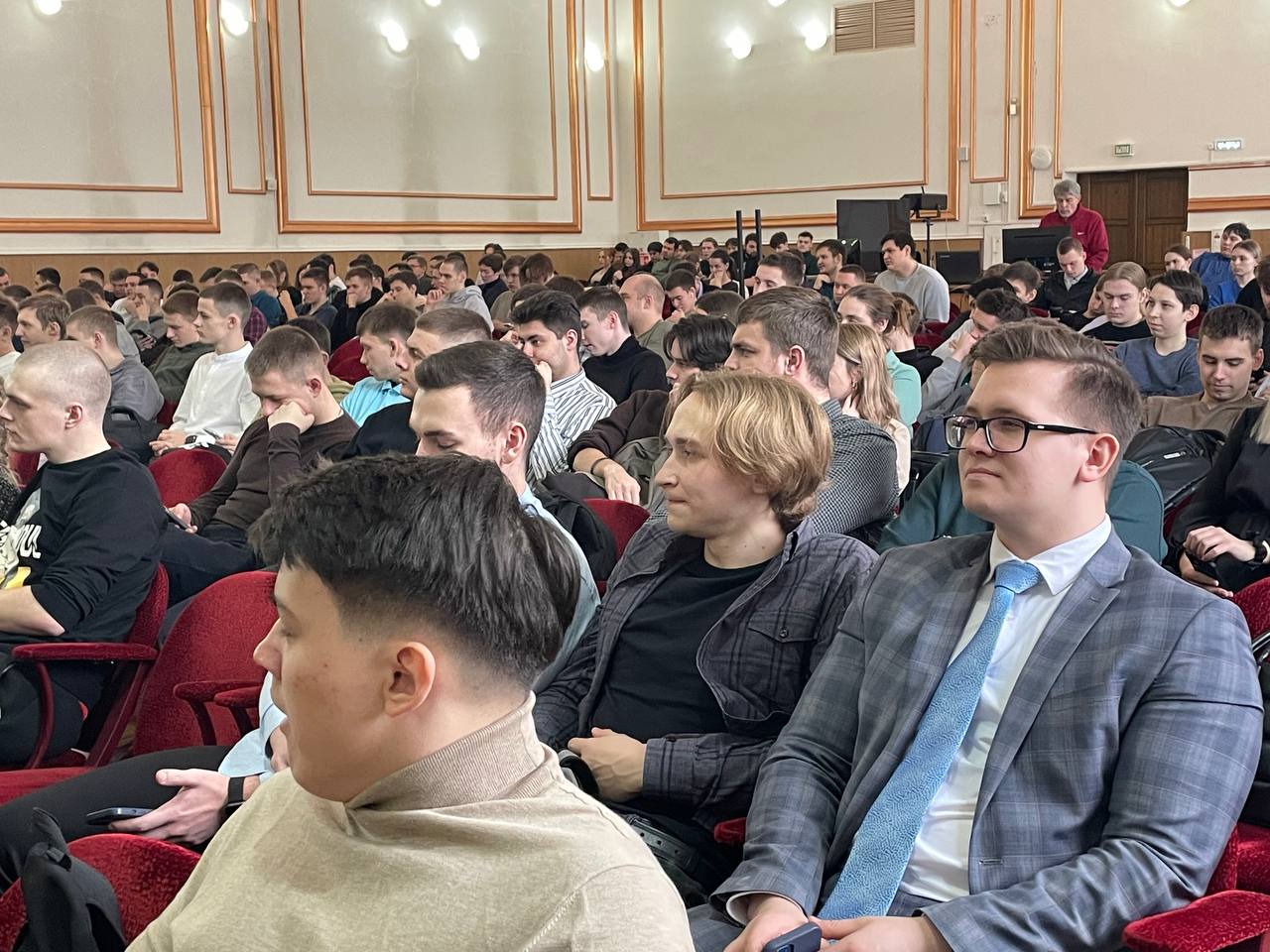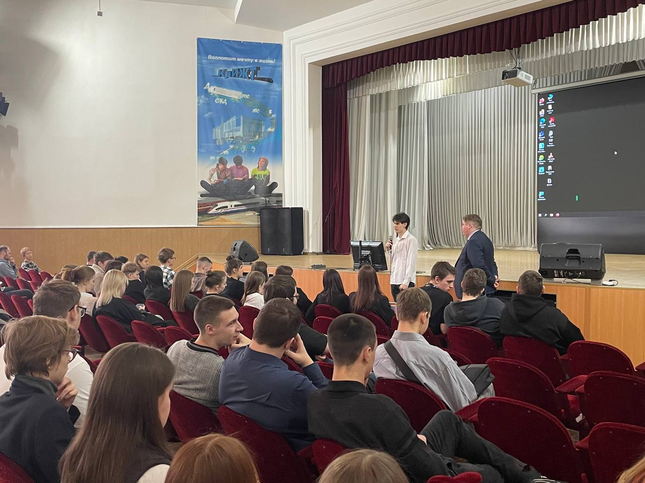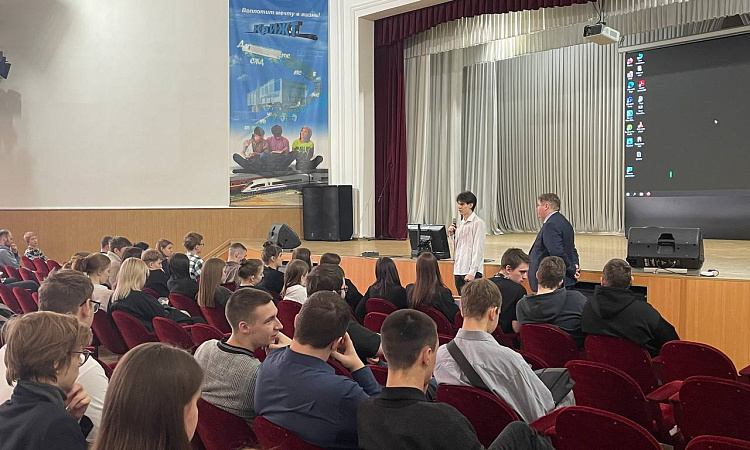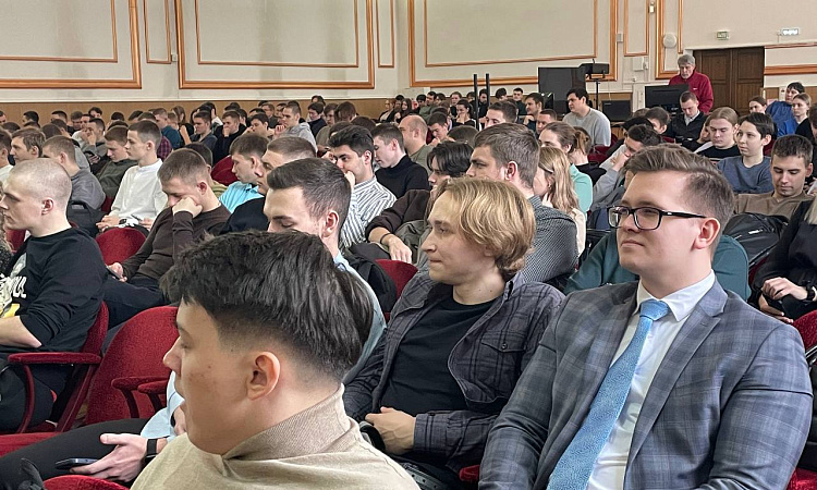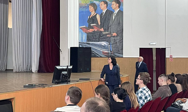 Перед студентами выступили участники прошлогоднего третьего трудового семестра Михаил Раздобарин (гр. СЖД 2-22-1) и Иван Лукин (гр. СОД 2-20-1). Они поделились опытом участия в проекте в 2023 году. Рассказали о своих положительных впечатлениях и пригласили к участию в новом сезоне остальных студентов.