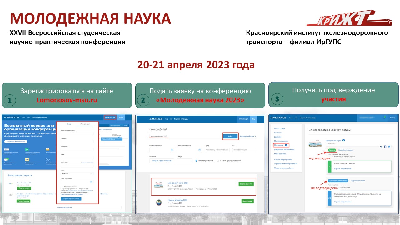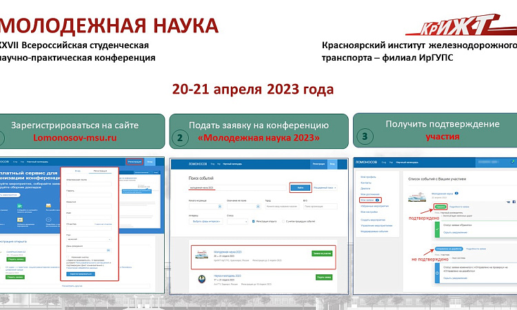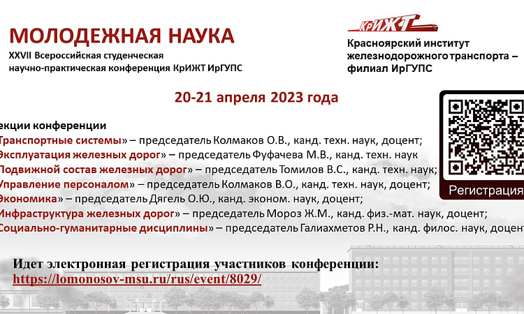 В КрИЖТ ИрГУПС будет проходить XXVII Всероссийская студенческая научно-практическая конференция «Молодежная наука». Конференция «Молодёжная наука» проводится среди обучающихся высших и средних учебных заведений, а также общеобразовательных заведений с целью формирования научно-технического, инновационного и творческого потенциала обучающихся в соответствии с перспективными тенденциями развития железнодорожной отрасли, а также вовлечения их в публикационную активность по результатам научной деятельности.