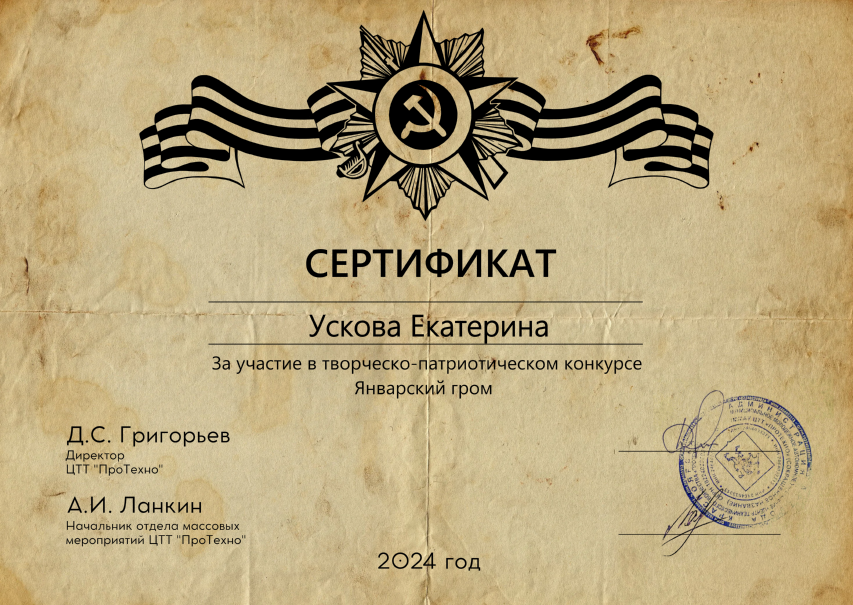 Нашу образовательную организацию представила студентка группы Д.9-23-2 Ускова Екатерина (руководитель-наставник Путинцева Ирина Викторовна). Екатерина выступала в номинации «Художественное чтение» со стихотворением Юрия Воронова «Январь сорок второго».
