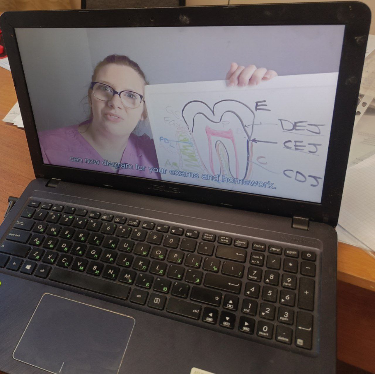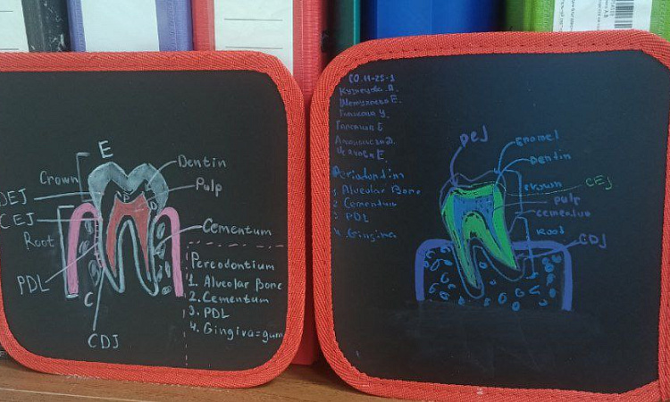 Группа разделилась на две команды, каждая команда получила собственную доску и набор фломастеров. Необходимо было на основе учебного видео на английском языке нарисовать диаграммы по изученному материалу об анатомии зуба.