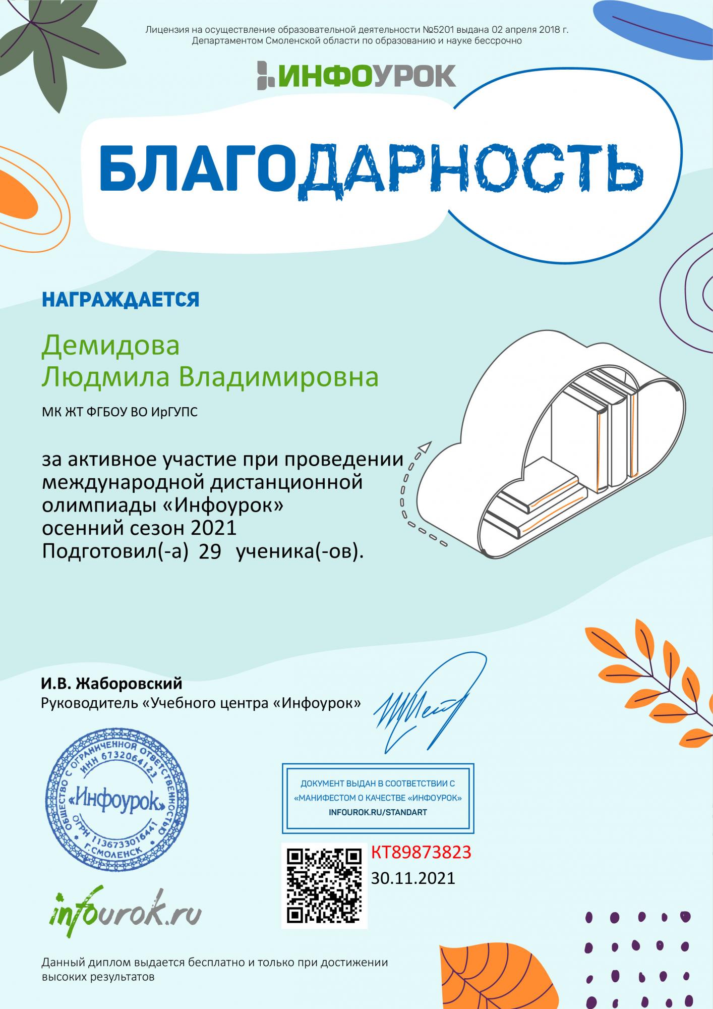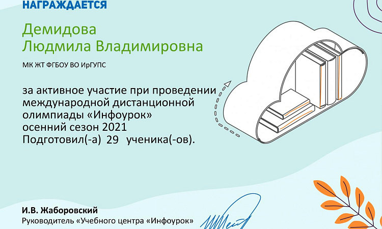В ноябре 29 студентов из групп СО.11-21-1(И,О), СД.11-21-1(И,О), СД.9-21-3(И,О) под руководством преподавателя Демидовой Л. В. приняли участие в международной олимпиаде по математике «Инфоурок».