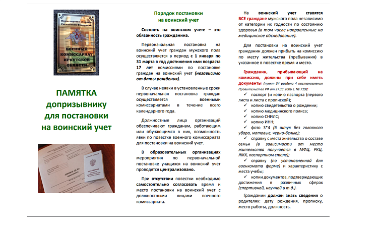 Первоначальная постановка на воинский учет граждан мужского пола осуществляется в период с 1 января по 31 марта в год достижения ими возраста