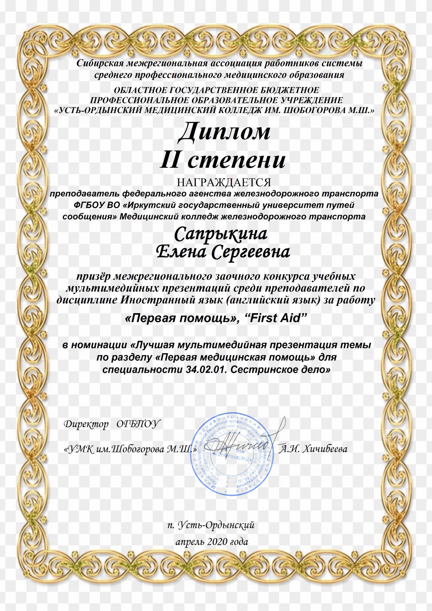 Сапрыкина Елена Сергеевна получила диплом II степени за работу «Первая помощь. First Aid» в номинации «Лучшая мультимедийная презентация темы по разделу «Первая медицинская помощь» для специальности 34.02.01. Сестринское дело.