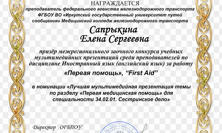 Преподаватель иностранного языка принял участие в межрегиональном заочном конкурсе учебных мультимедийных презентаций по разделу «Первая медицинская помощь» специальностей 31.02.01. Лечебное дело, 34.02.01. Сестринское дело проводимым ОГБПОУ «Усть-Ордынский Медицинский Колледж Им. Шобогорова М.Ш.»