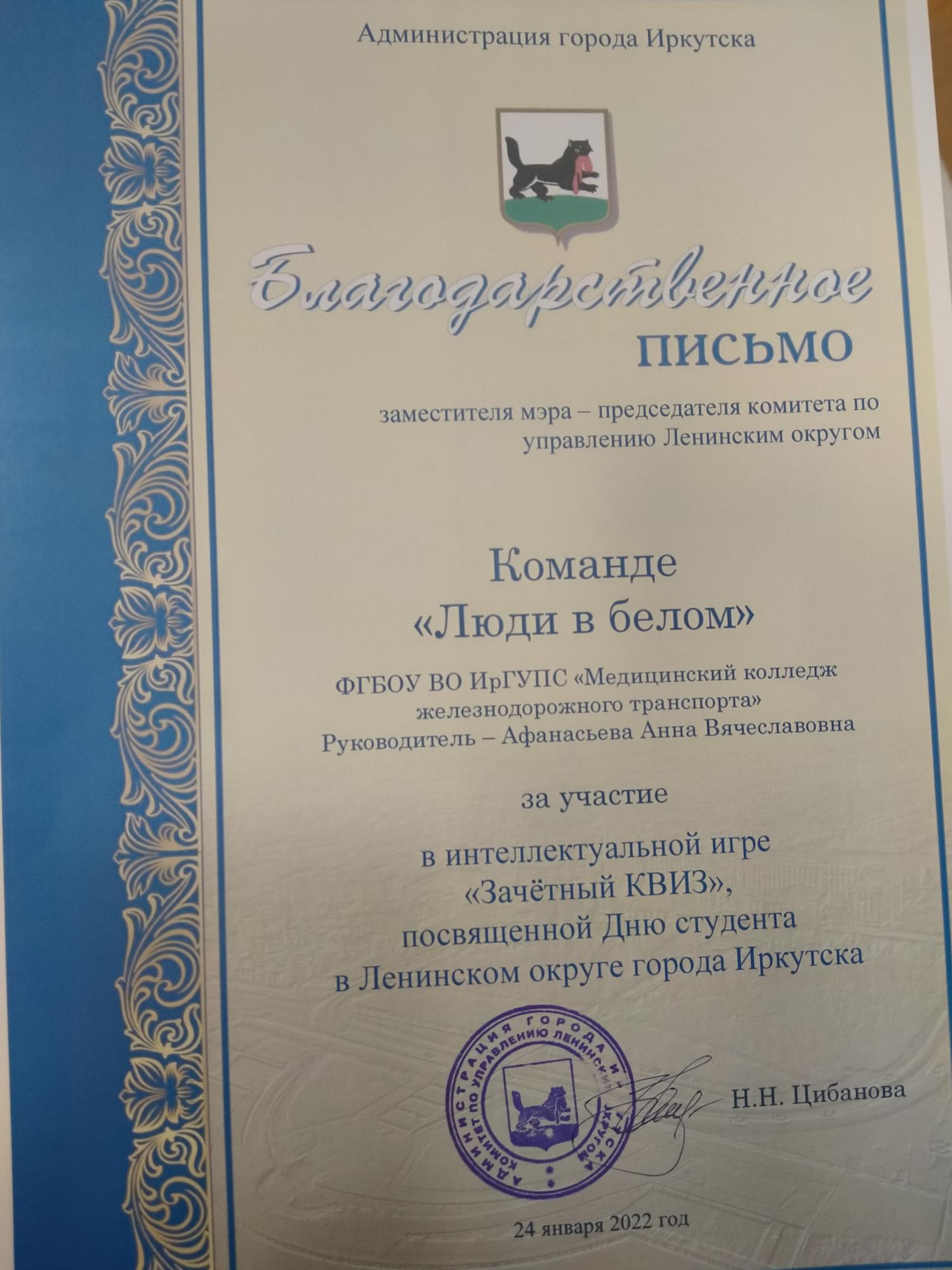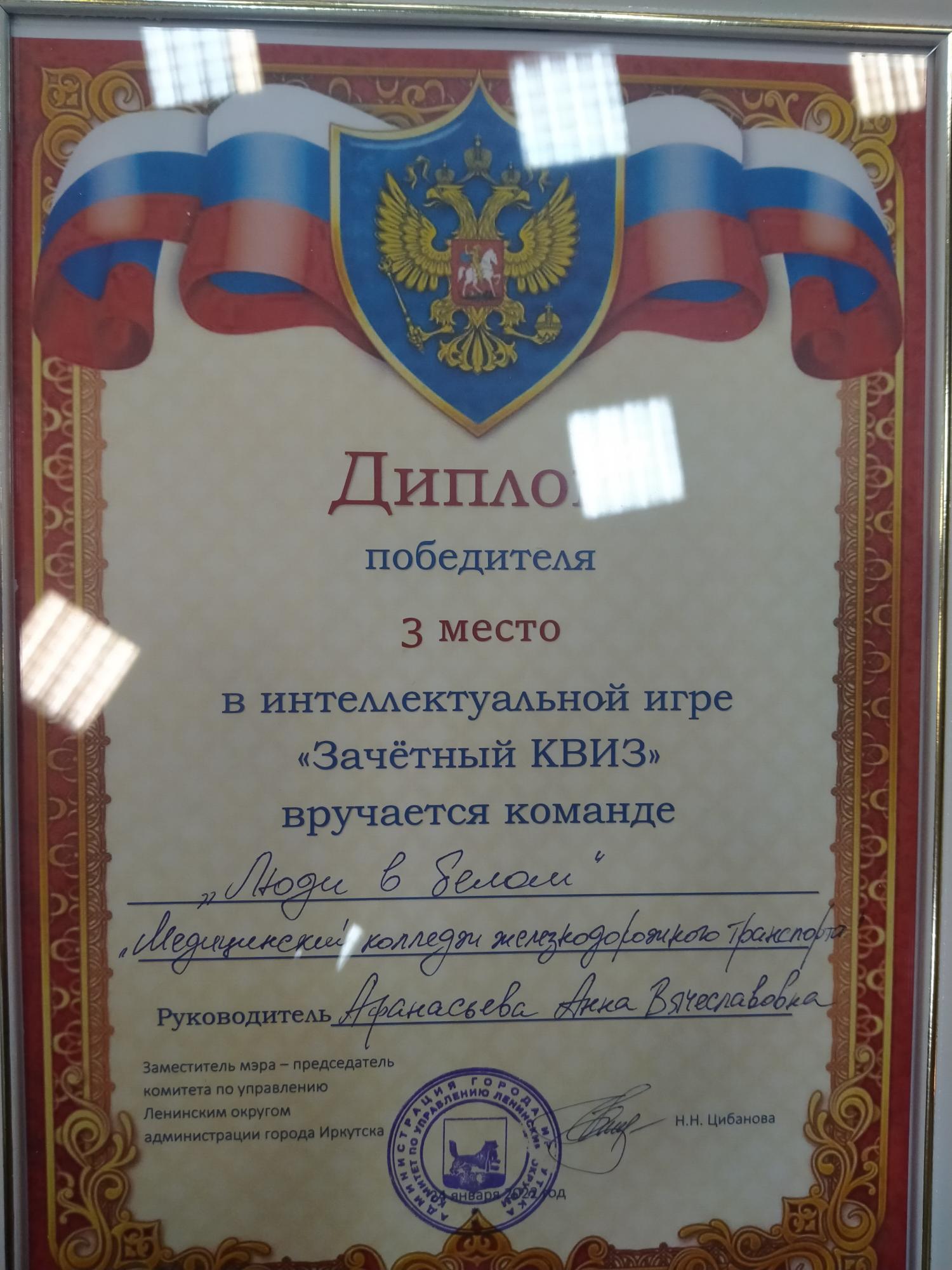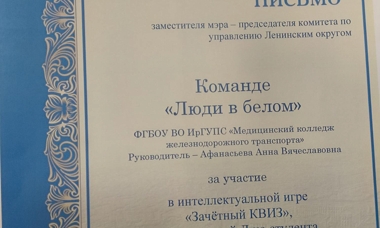 24 января 2022года на базе Иркутского техникума авиастроения и материалообработки прошла интеллектуально-развлекательная игра "Зачётный КВИЗ" для студентов СПО Ленинского округа посвященная дню студента. Не смотря на конкуренцию среди команд, игра проходила в теплой дружеской атмосфере, с шутками и непринуждённым общением. Мероприятие очень понравилось нашим участникам, выражаем огромную благодарность организаторам и хозяевам за теплый прием и незабываемые эмоции. Участники от нашего колледжа, студенты группы СД.9-20-3: Беклемищева Валентина, Бобрякова Анастасия, Левина Александра, Могильникова Наталья, Сафонова Надежда достойно выступили и заняли 3 место, с чем искренне их поздравляем! Желаем дальнейших побед и новых достижений!