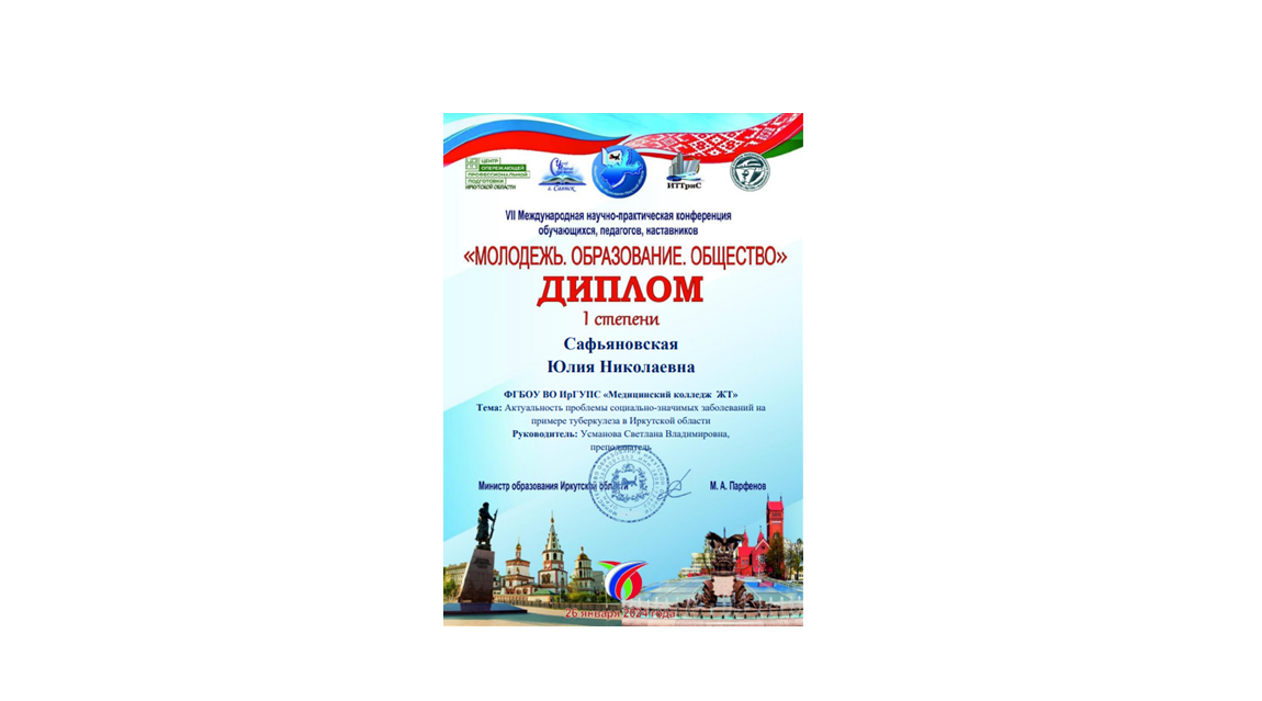 Сафьяновская Юлия с темой «Актуальность проблемы социально - значимых заболеваний на примере туберкулеза в Иркутской области», Медицинский колледж ЖТ ИрГУПС.