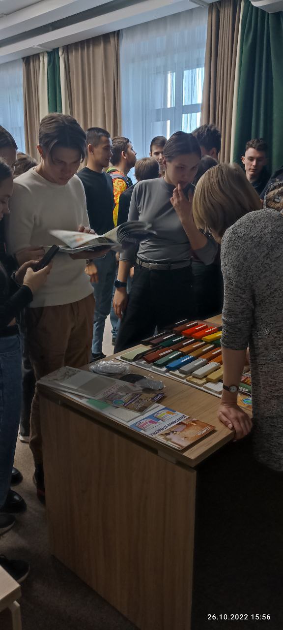 26 октября на экскурсии лакокрасочного завода "Капитель" побывали студенты 4 курса специальности СЭЗС. В программе мероприятия студенты узнали историю создания завода, его продукции и в чем ее уникальность. В лаборатории завода был проведен организаторами мастер-класс, где был приоткрыт занавес к секретам создания рецептов продукции фирмы "Капитель" и у каждого из студентов была возможность поучаствовать в нанесении различных продуктов и в их испытании.