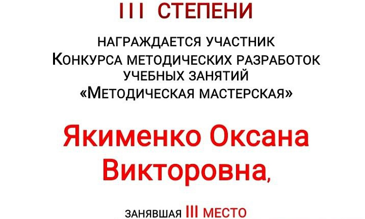 Поздравляем преподавателя Якименко Оксану Викторовну с призовым 3 местом по специальности «Строительство железных дорог, путь и путевое хозяйство»